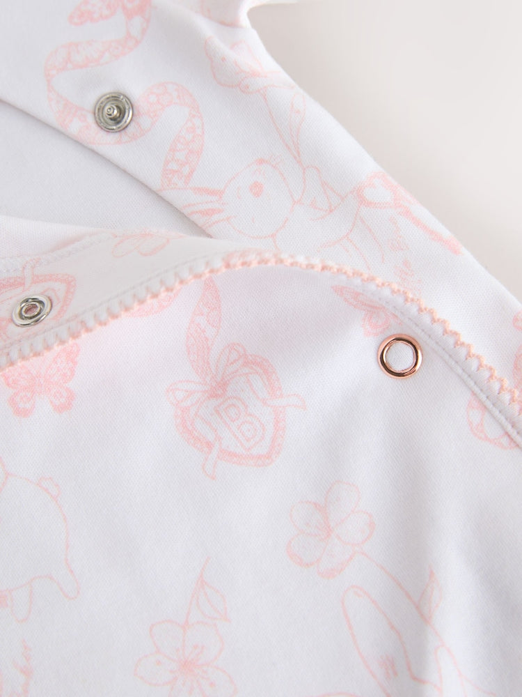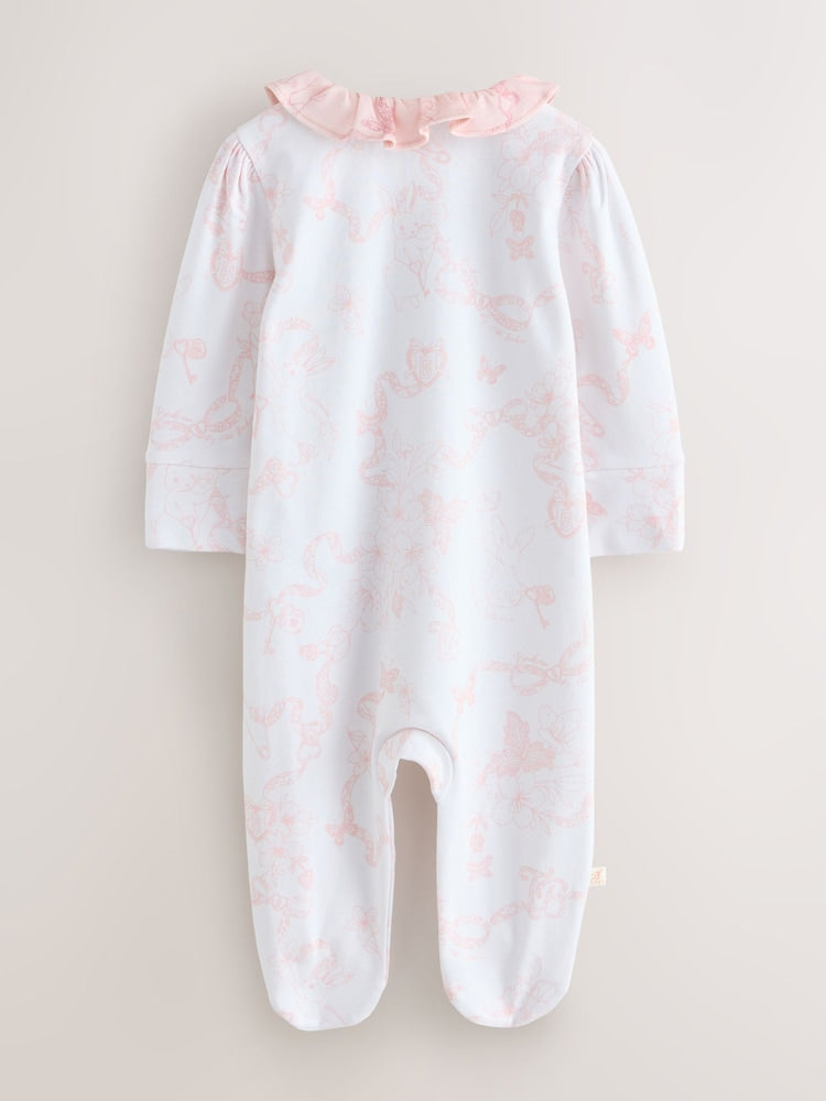 Give the gift of Baker this season, with this beautiful layette gift set from Baker by Ted Baker. This 6 piece set is the perfect introduction to designer style for any new arrival. Thoughtfully curated, the set includes two coordinating sleepsuits, two matching bibs, and two pairs of scratch mittens, all designed with the Baker signature blend of practicality and elegance. The pieces are crafted from a premium, ultra-soft cotton fabric that is breathable and exceptionally gentle against a newborn's delicate skin. The set features two beautiful variations; a sweet solid pink and a crisp white adorned with a delicate, bunny and bow prints. Both styles are elevated by refined details, including ruffled collars with picot-trim edges, shimmering rose gold-toned Baker foil branding, and signature 3D grosgain bow accents. Put together with our Baker gift bags for the ultimate gift idea