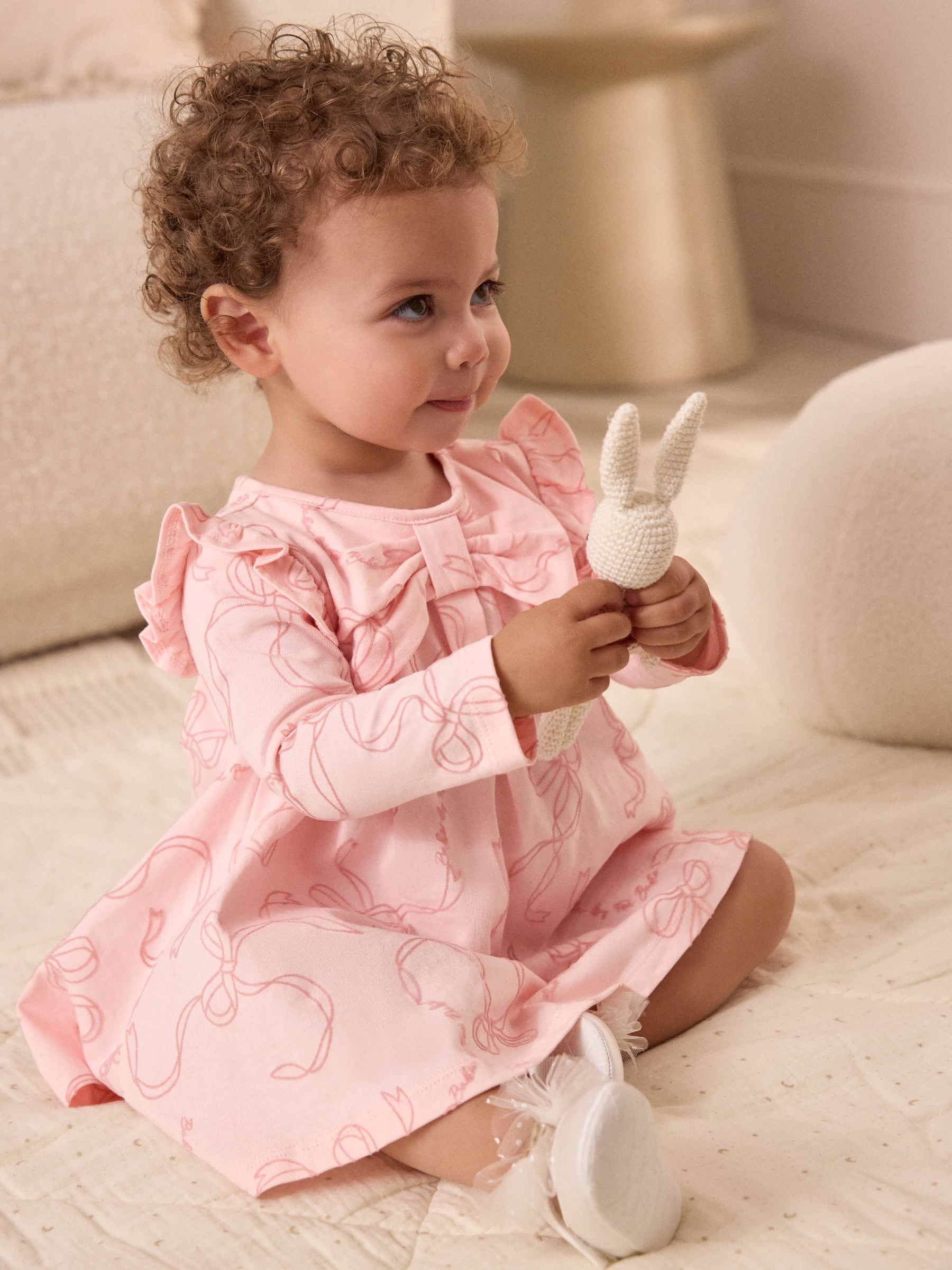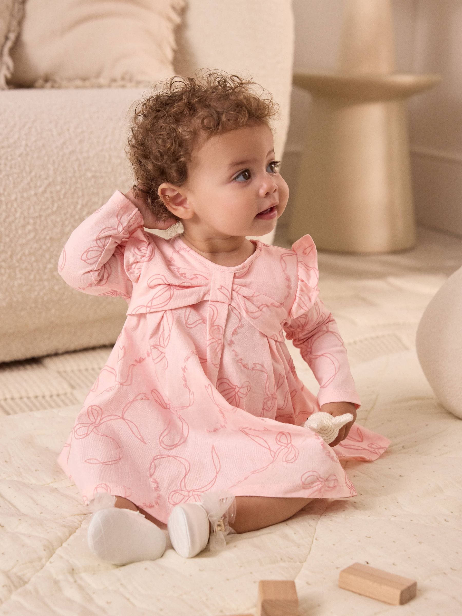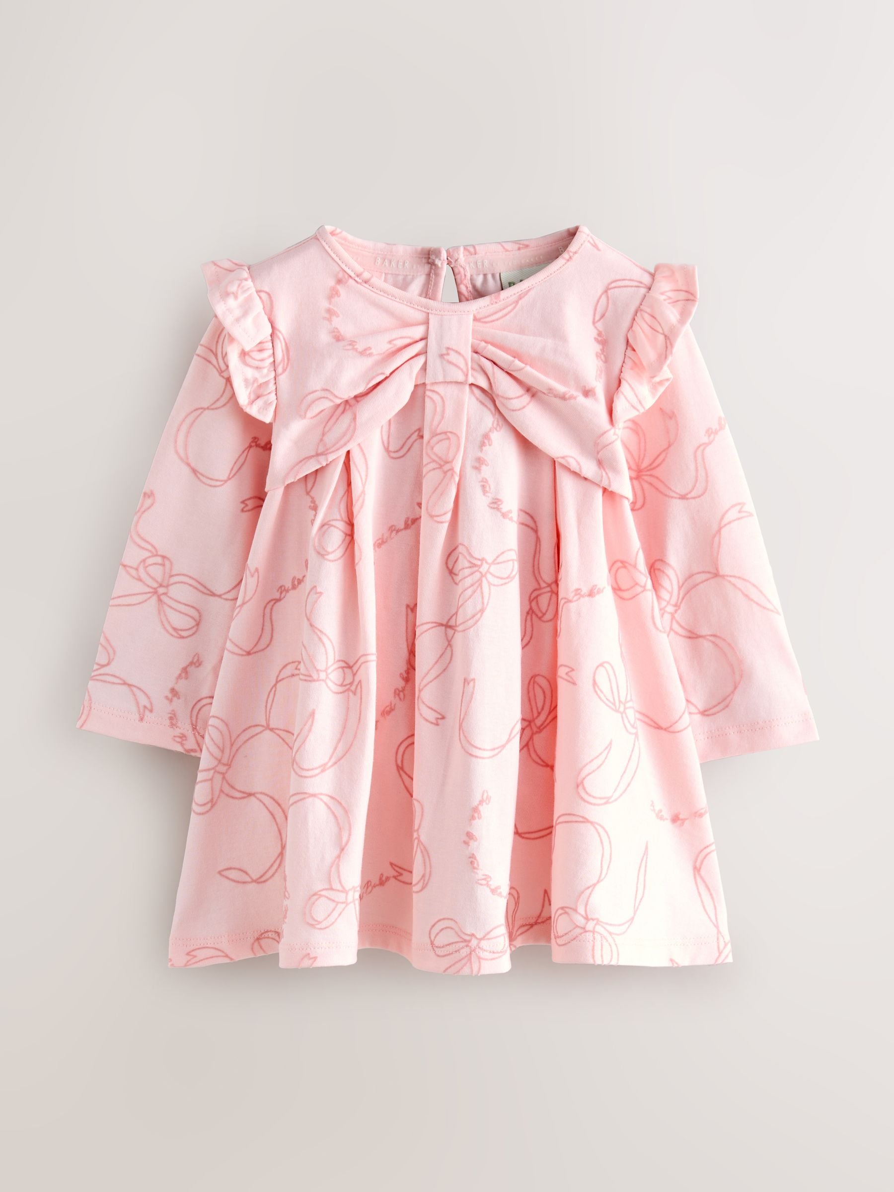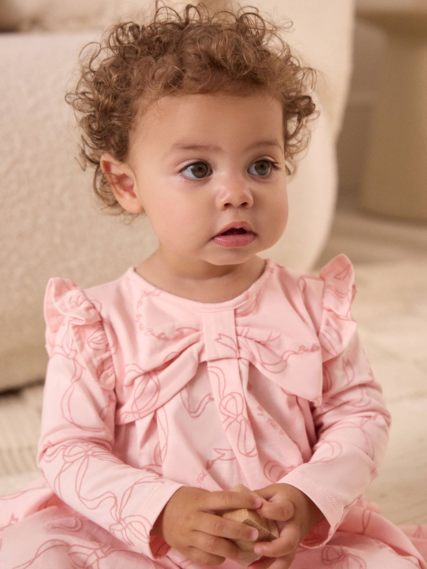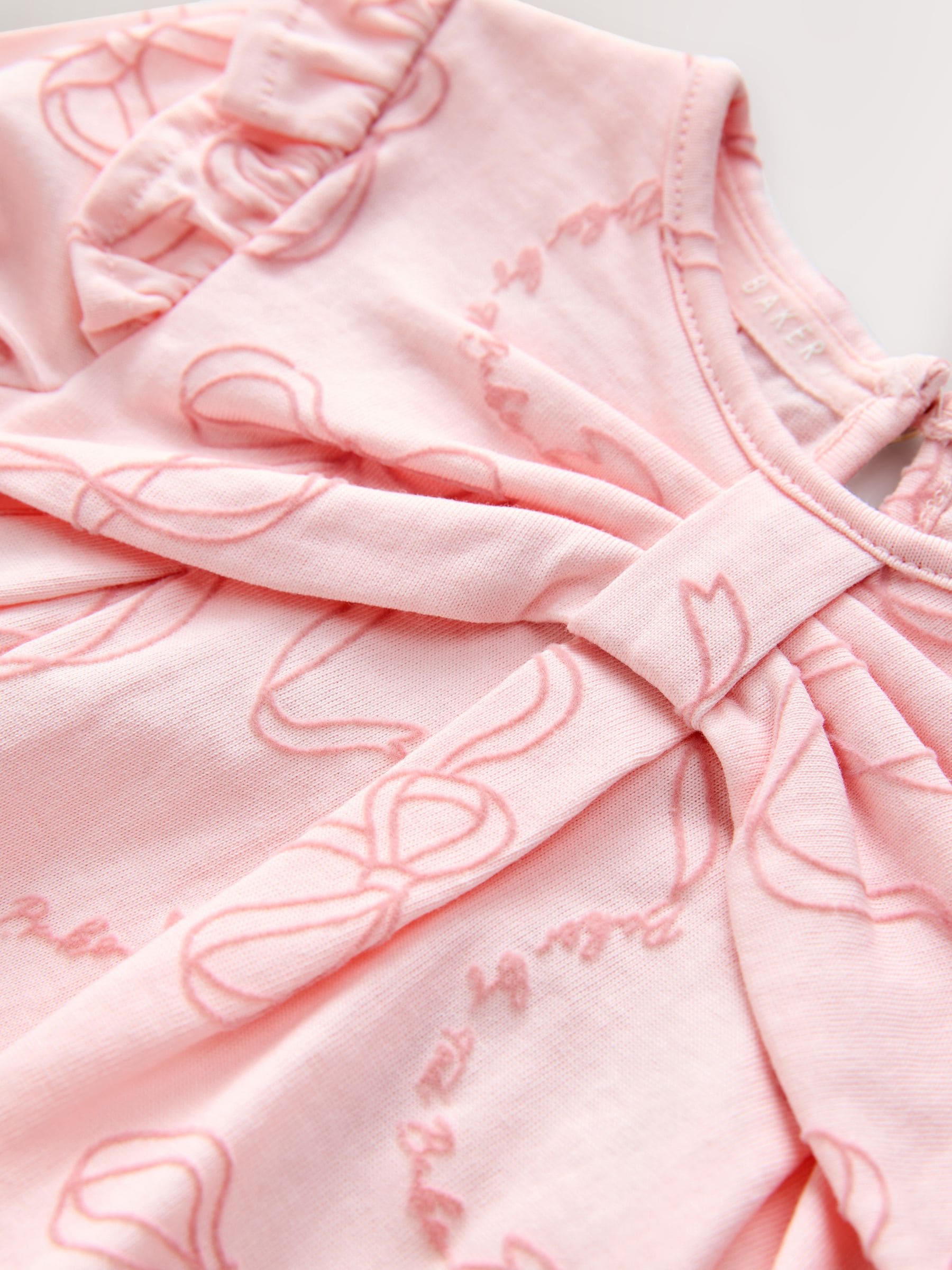 Dress her up in this adorable bow detail jersey dress from Baker by Ted Baker. This cute piece features all over flocked bow design, with frilled sleeves and a bow mock design at the chest. For closure it has a keyhole opening at the back with a Baker branded button. Pair with our baby socks and padders to complete her outfit! 100% Cotton. Country of Origin: China