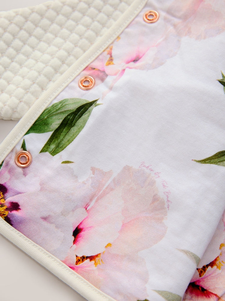 Your little one will look cute and cosy in this quilted hooded jacket from Baker by Ted Baker. This hooded jacket with ears comes in a quilted design in an all over glittered fabric. The layering piece also includes a quilted hood with ears and a gorgeous floral printed lining, not to mention adorable grosgrain bows at the ears. Details include a frill at the yoke seam going from the front to the back, bow shaped pockets and gold Baker branded poppers. The cutest cosy piece your little one will adore.