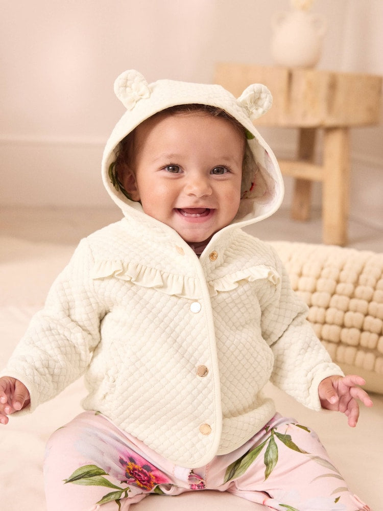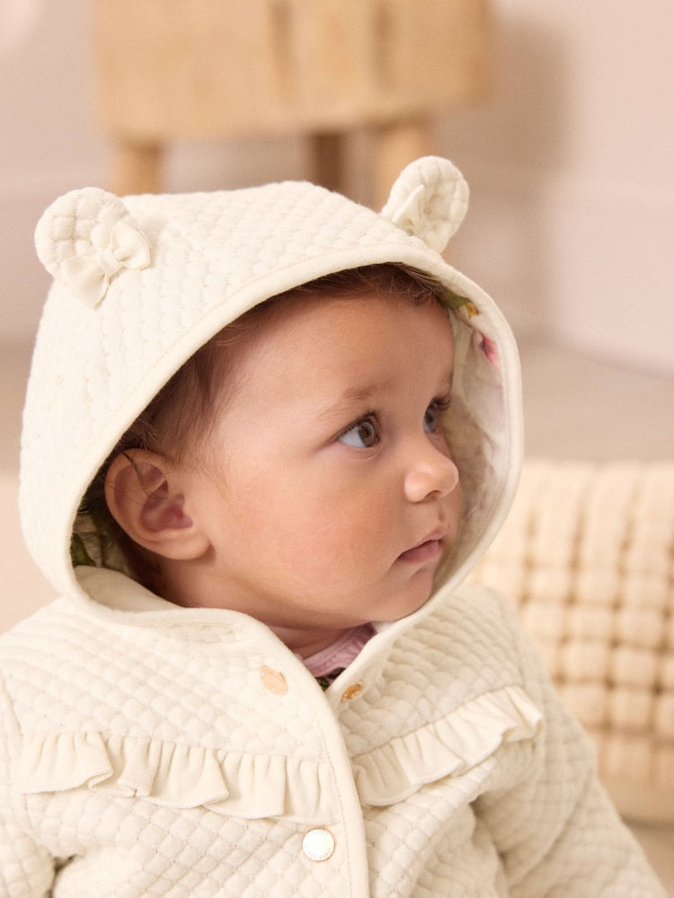 Wrap your little one in warmth and style with this Baker by Ted Baker quilted hooded jacket. Crafted from a luxurious cotton-blend fabric with shimmering lurex detailing, this jacket features a charming hooded design with adorable ears and floral-printed lining. The quilted construction provides excellent insulation, while thoughtful details—including a decorative frill at the yoke, bow-shaped pockets, and grosgrain ear bows—add playful character. Gold-tone branded poppers ensure secure fastening. Perfect for layering through cooler months, this piece combines comfort with whimsical design that children love.