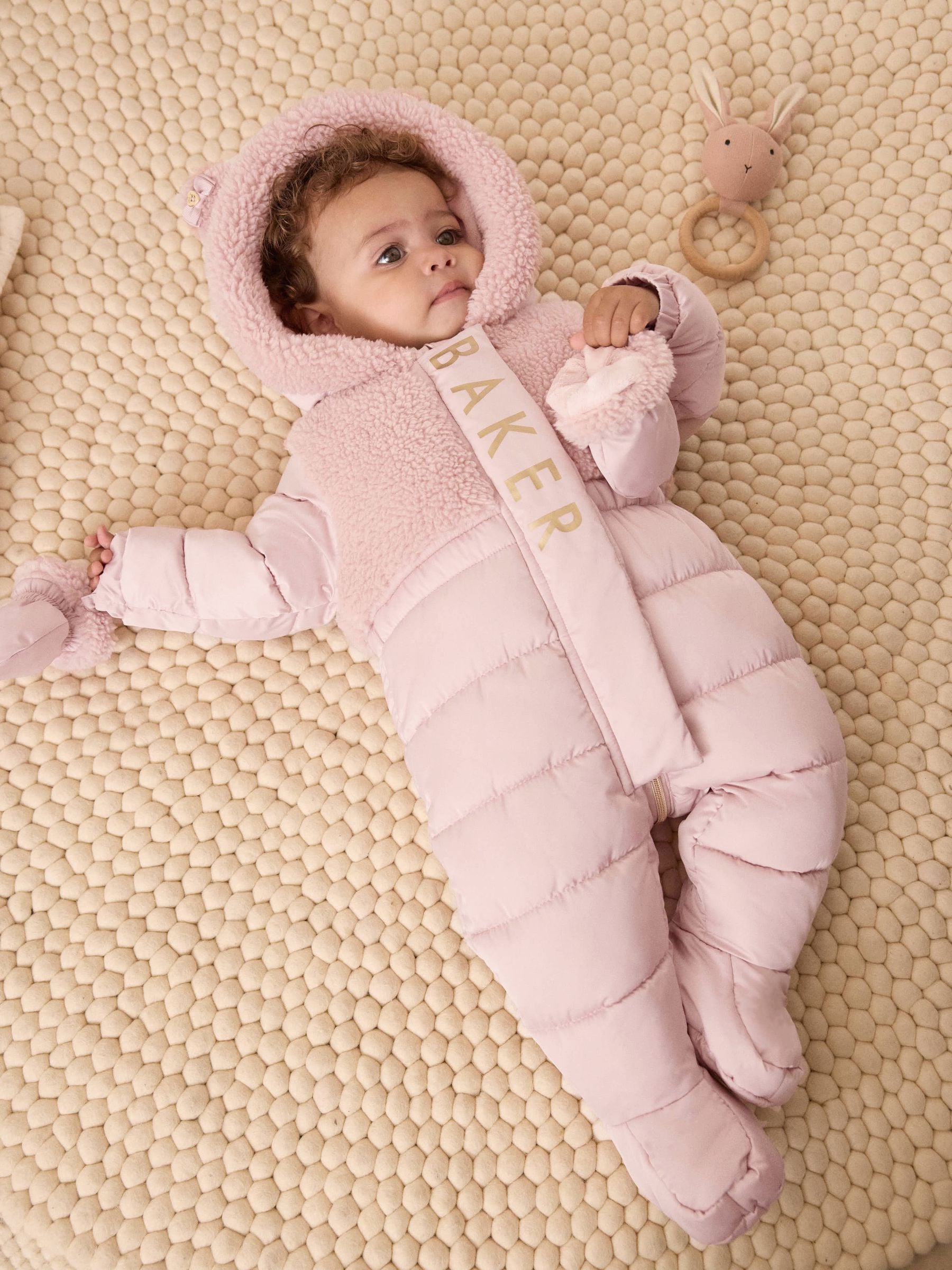 Wrap your little one up warm and cosy for the upcoming winter weather in this adorable and cosy borg snowsuit from Baker by Ted Baker. Fleece lined in a warm fabric, this padded snowsuit includes detachable mittens, front zip and popper fastening and a faux fleece lined hood with cute 3D ears. Details feature gold embroidered Baker branding at the bottom of the feet, with gold foil branding on the inside zip guard. Padded fabric Detachable mittens Baker branded hardware Ages 12 months and older do not include covered legs. Shell 100% Polyester. Lining 100% Polyester. Wadding 100% Recycled polyester. Country of Origin: China Warning: Keep away from fire and flames.