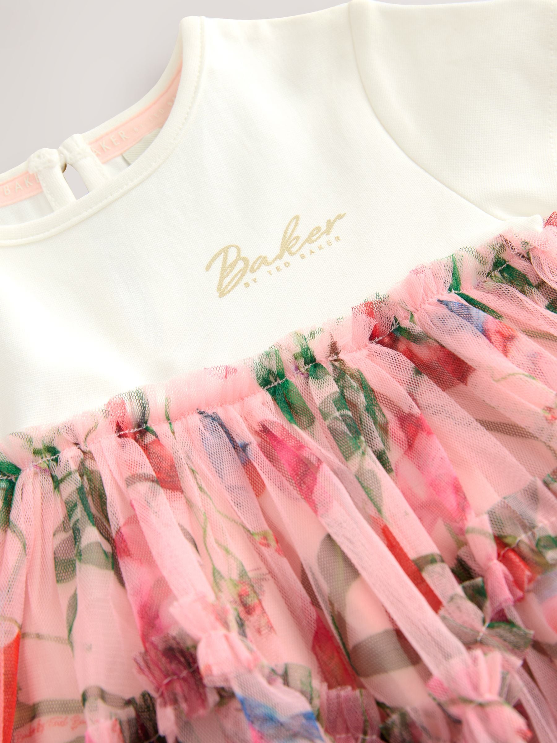 Pretty in florals, she'll look adorable in this floral ruffle mesh dress from Baker by Ted Baker. This dress comes in a soft cotton fabric mix with a beautiful soft mesh mockable skirt. The dress includes the iconic gold foil Baker branding on the top, with ruffled details in the skirt. Finished with a branded Baker button at the back neck for easy closure. Perfect for any time of the year, you can't go wrong with this dress. Mockable design Ruffle mesh skirt Gold foil Baker branding Bodice 95% Cotton, 5% Elastane. Skirt 100% Polyester. Skirt Lining 100% Cotton. Country of Origin: China