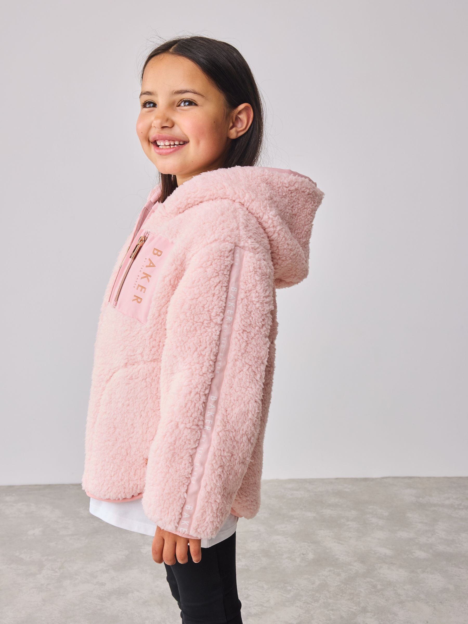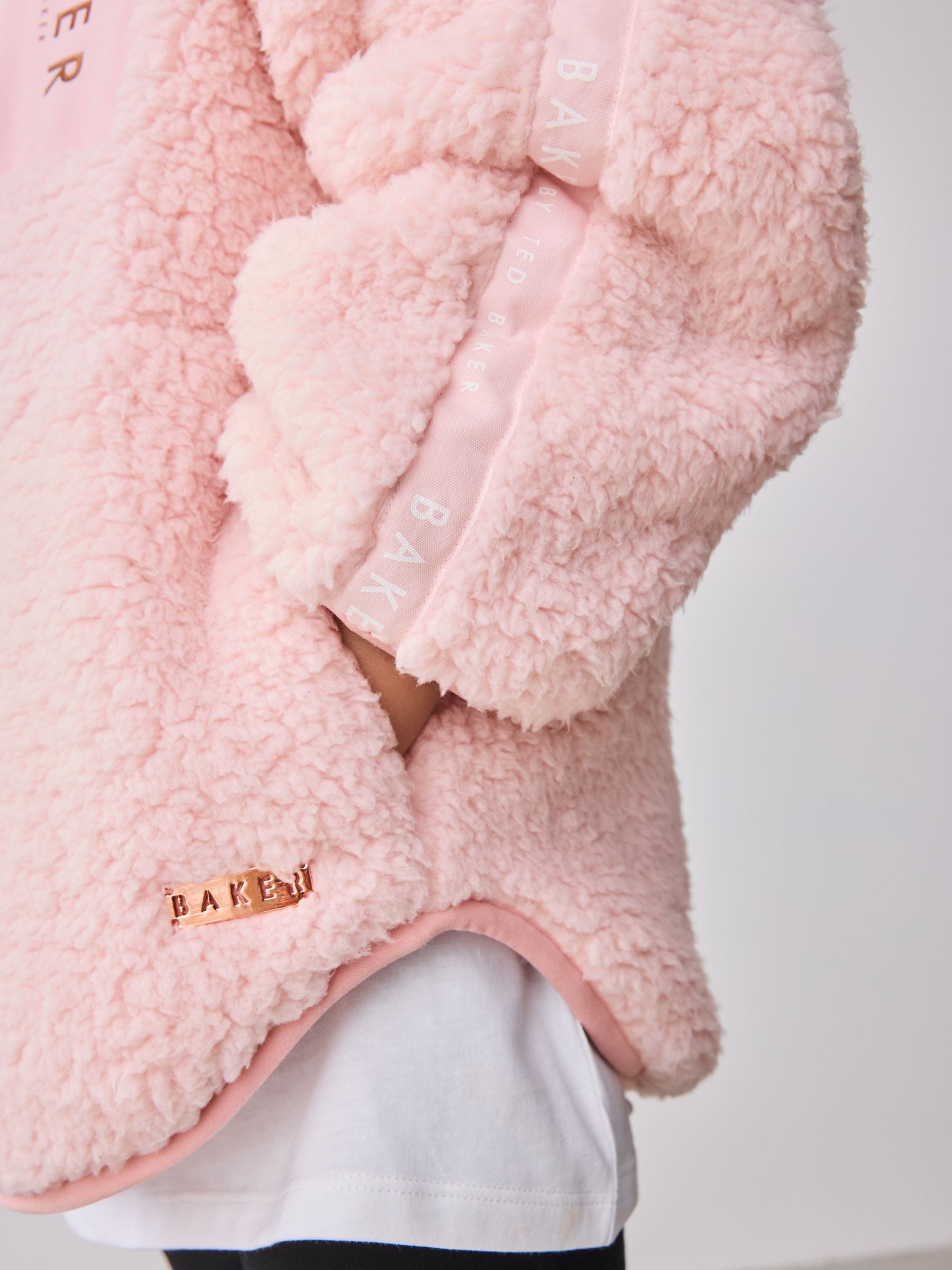 This fleece jacket from Baker by Ted Baker is the perfect layering piece this season. This jacket comes in a soft borg teddy fleece, with soft jersey lining inside. Featuring large branded Baker embroidery across the back, and branded Baker tape detailing down the arms. This fleece also includes a branded patch pocket on the front, along with rose gold branded hardware. Pair with some jeans and trainers for the perfect outfit. Baker branded tape Branded patch embroidery Rose gold hardware Shell 100% Polyester. Hood Lining 100% Cotton. Country of Origin: China