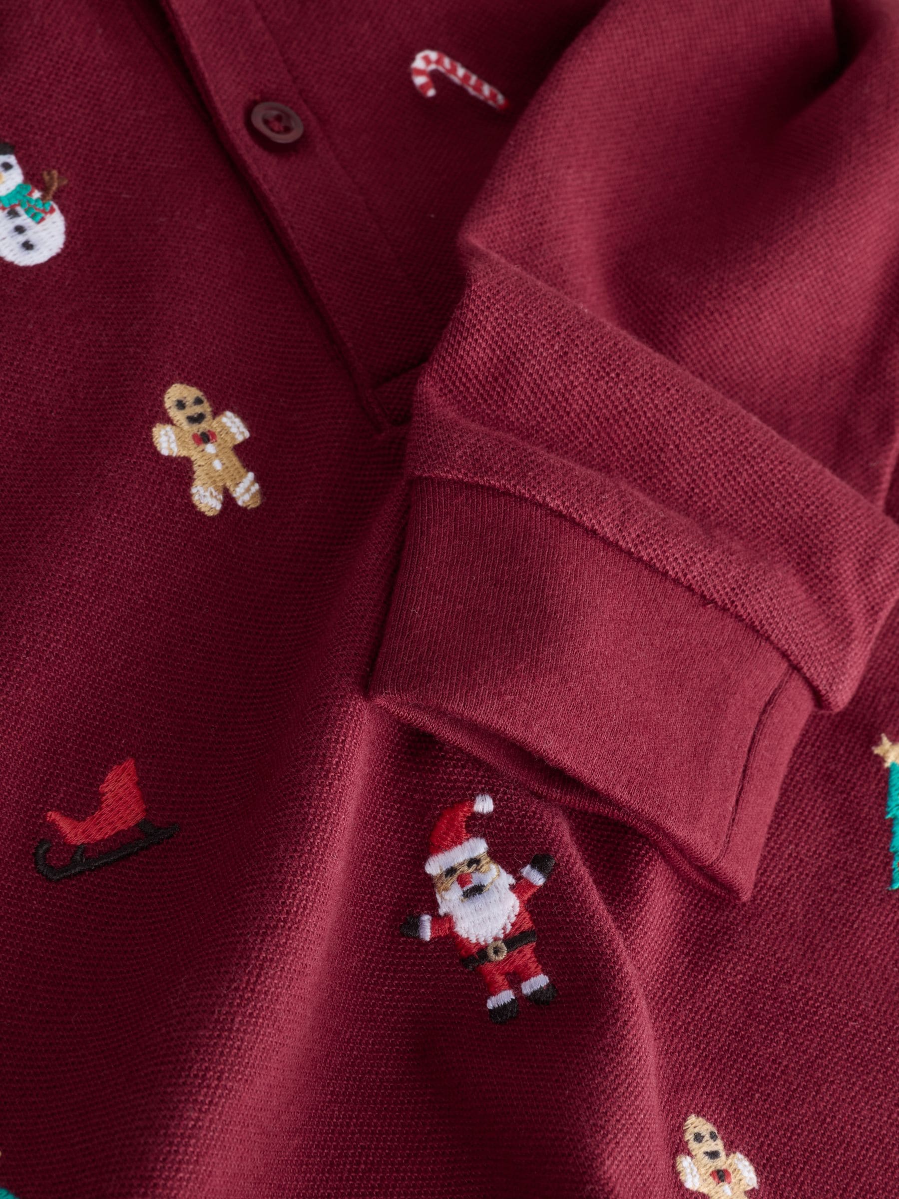 Berry Red Christmas All-Over Embroidered Long Sleeve Polo Shirt (3mths-7yrs)