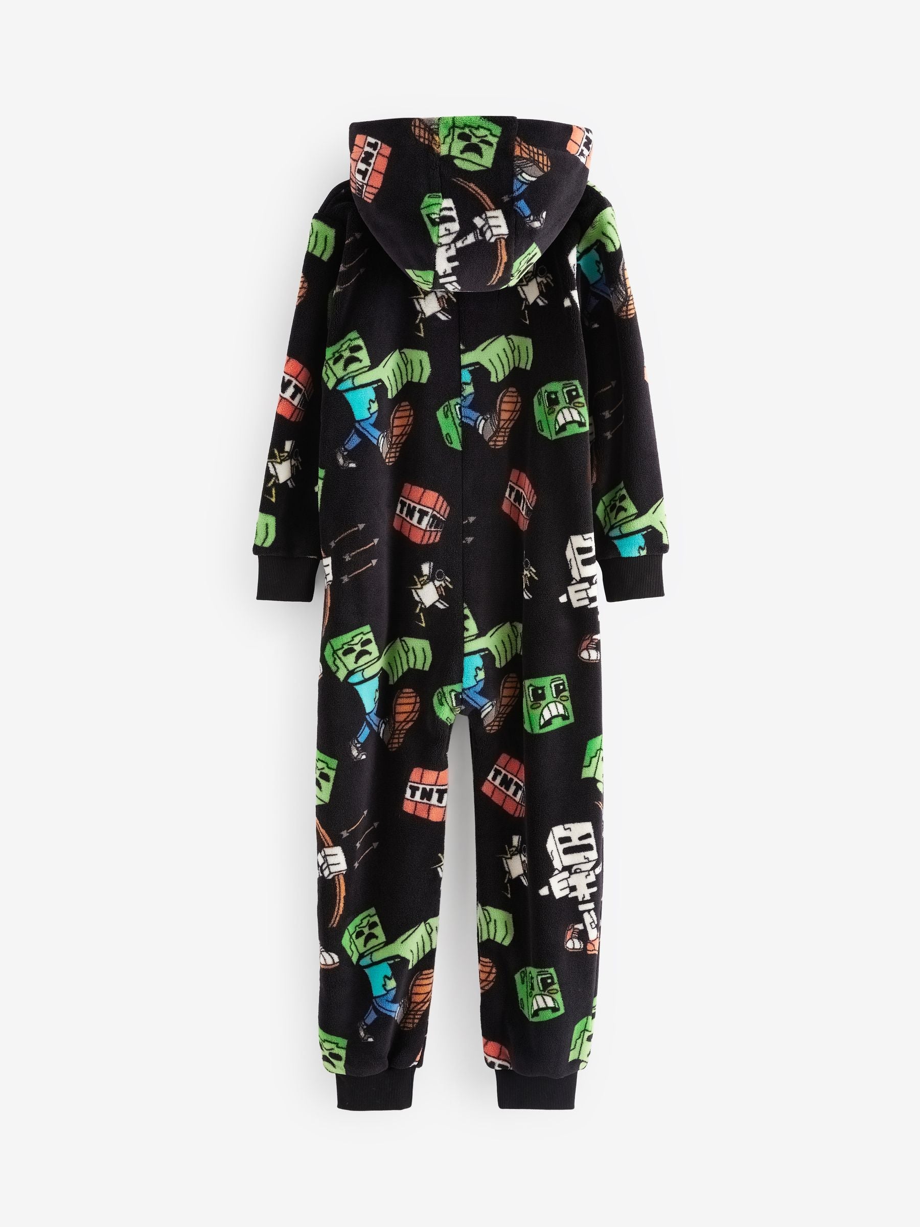 This cosy fleece all-in-one is perfect for Minecraft fans, featuring an all-over print with their favourite characters, with a full zip fastening, a set-in hood and ribbed hems. All-in-one Regular fit Fleece fabric Zip fastening Licensed Minecraft graphics Set-in hood Machine washable. 75% Recycled polyester, 25% Polyester. Country of Origin: China Warning: Keep away from fire and flames.