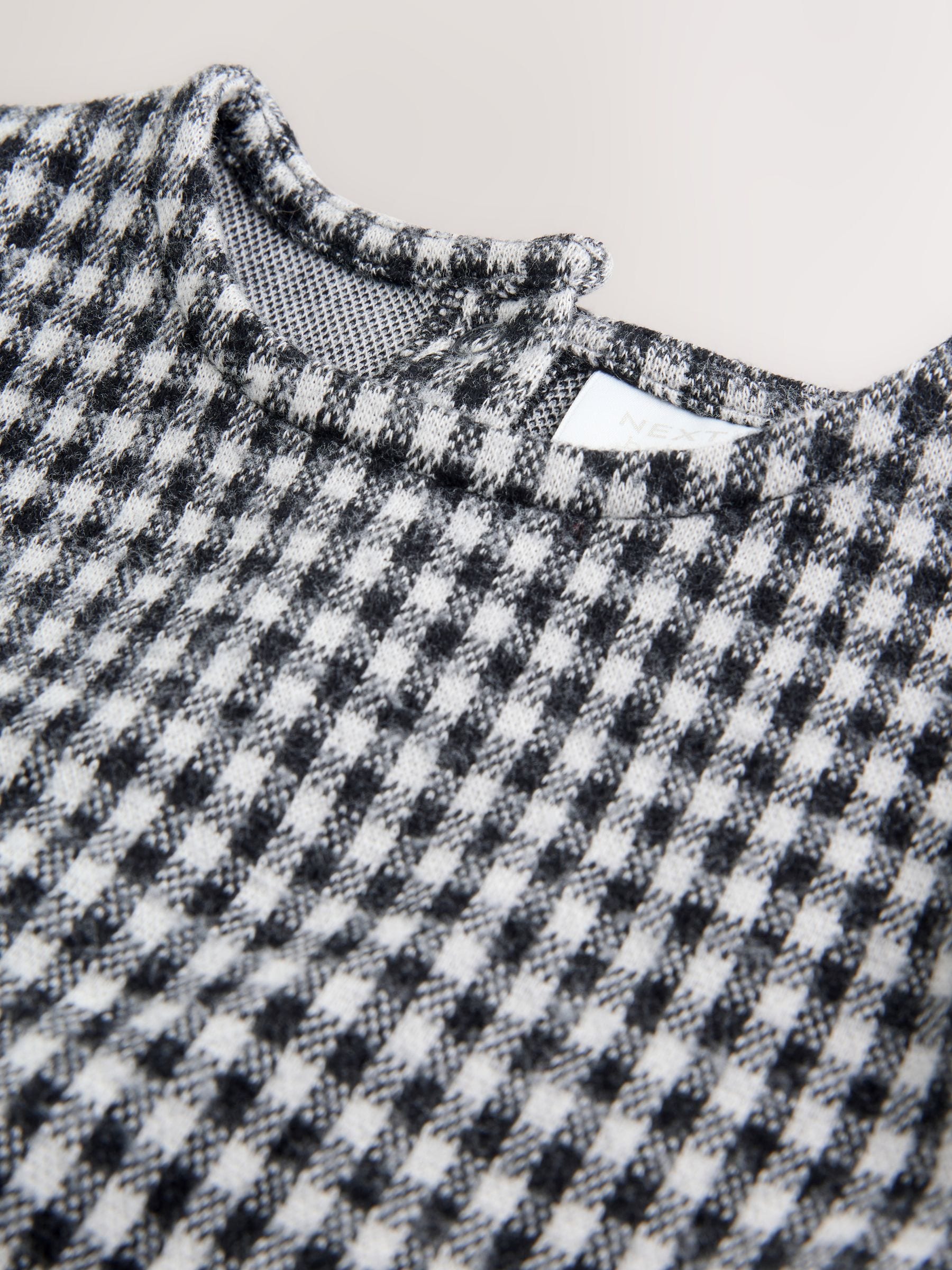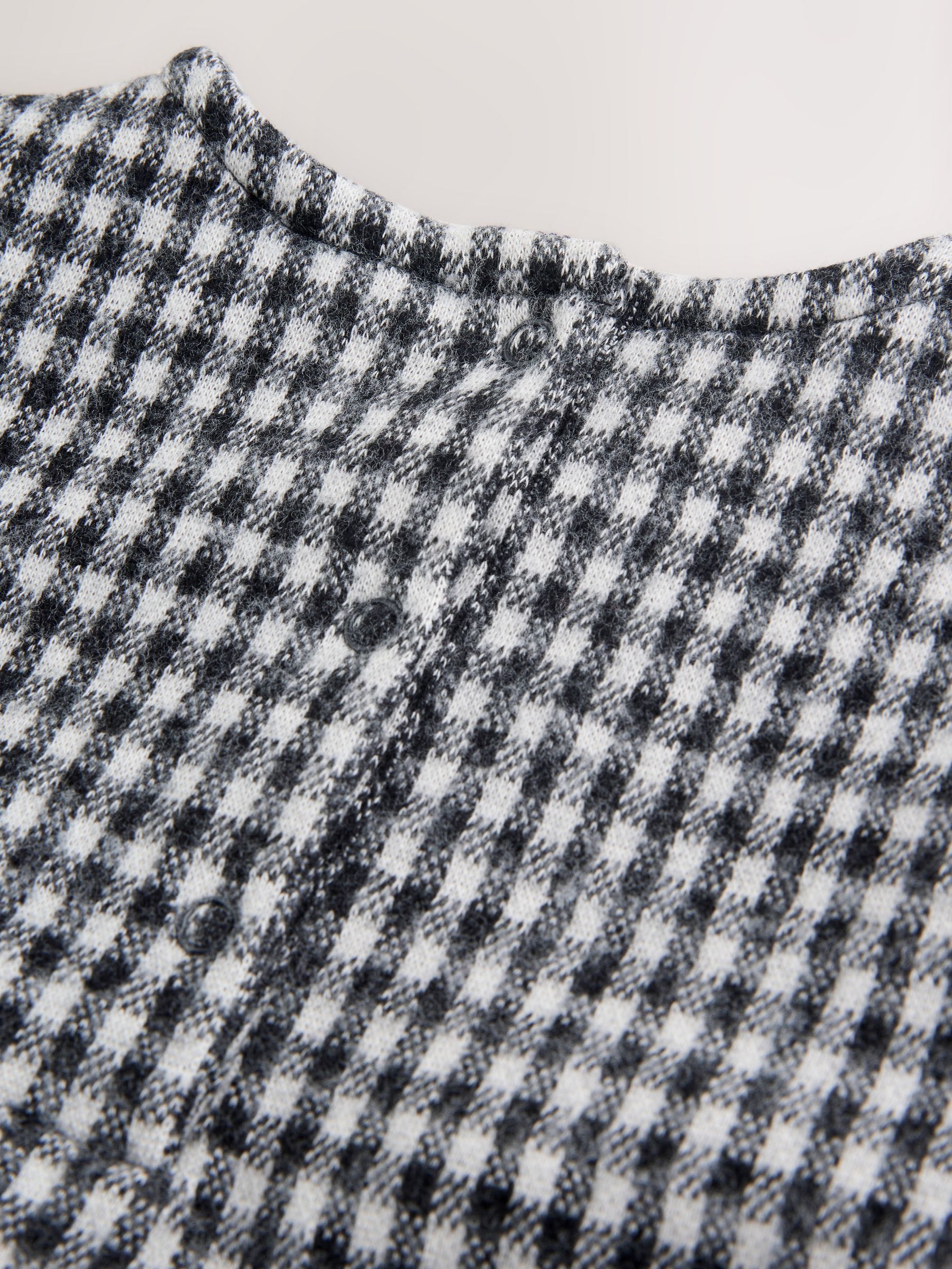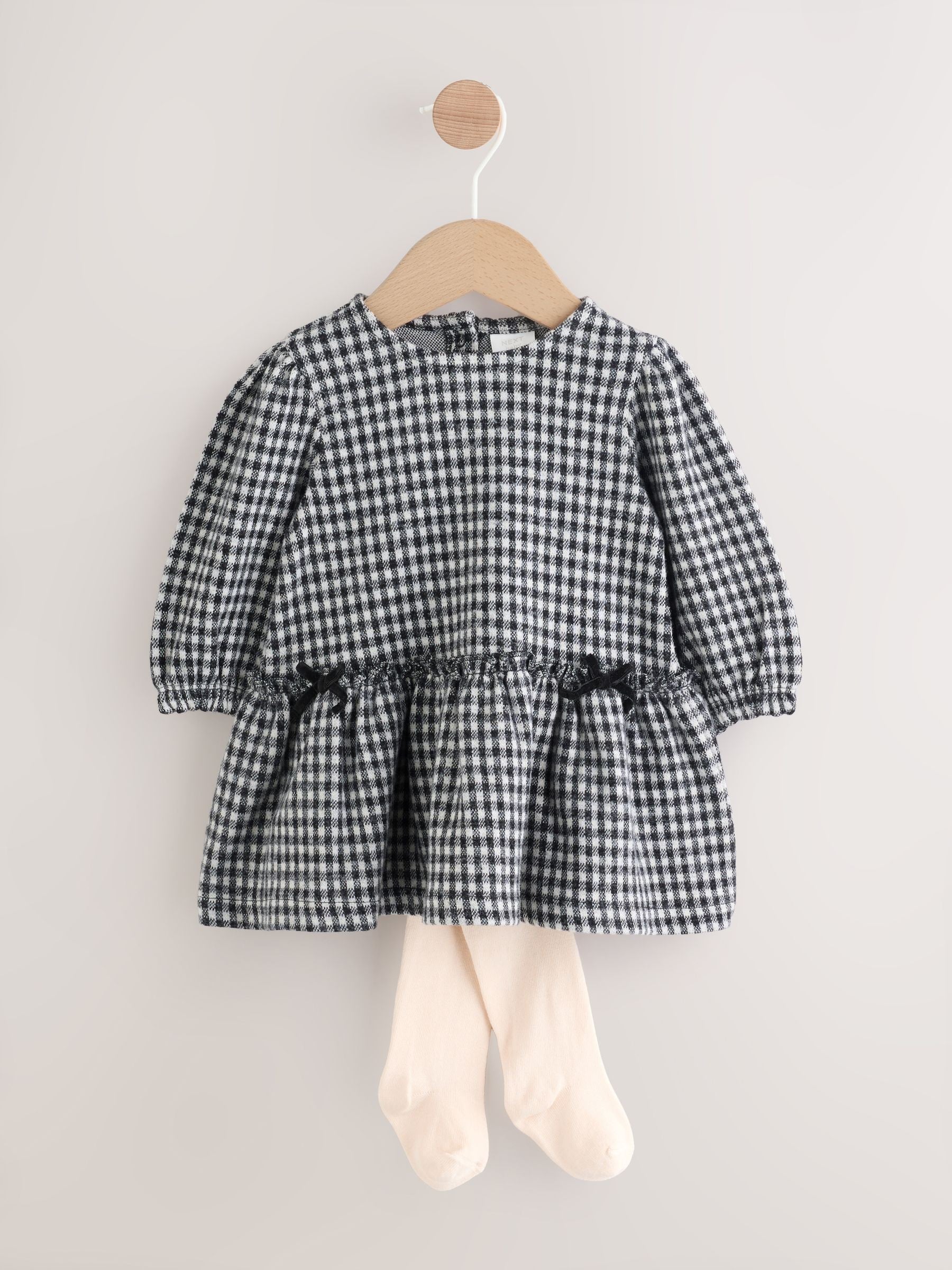 Unbox an adorable outfit with this black and grey check dress and tights set. Made from a supersoft brushed check fabric, the long-sleeve dress features a frill waist and sweet-bow details. Paired with coordinating tights, it's a perfect choice for keeping your little one cosy and stylish. Supersoft brushed check fabric Frill-waist detail Bow details Long sleeves Crew neck Tights included Dress 85% Cotton, 15% Polyester. Tights 73% Cotton, 25% Nylon, 2% Elastane. Country of Origin: India Warning: Keep away from fire and flames.