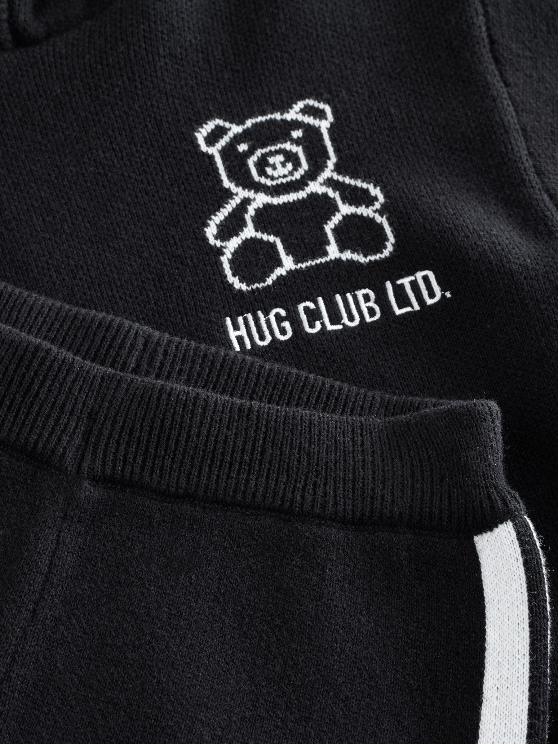 Ready for their next adventure, this black and white bear knitted set is a comfortable and cool choice. The soft VPN yarn and a relaxed fit hoodie and slim-fit joggers provide ultimate comfort for all-day play. The set is finished with fun bear details on the front and back of the hoodie to add a playful touch. Soft VPN yarn Bear details on the front and back Hoodie and slim-fit joggers Ribbed cuffs and hem Hooded top Hoodie and Jogger 100% Cotton. Country of Origin: China