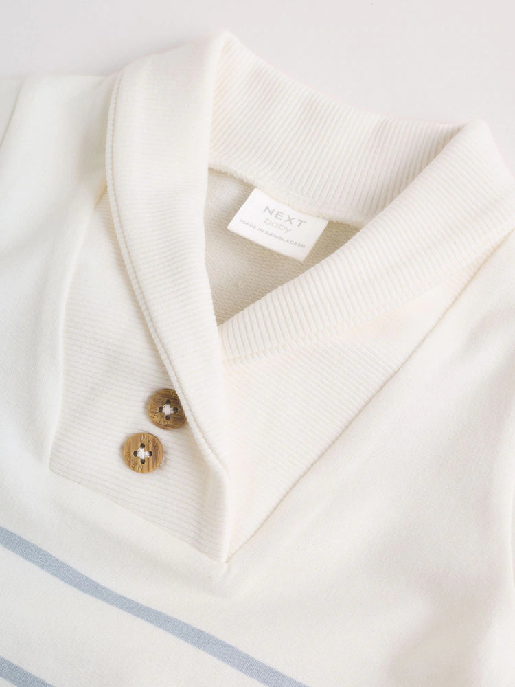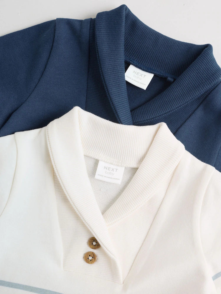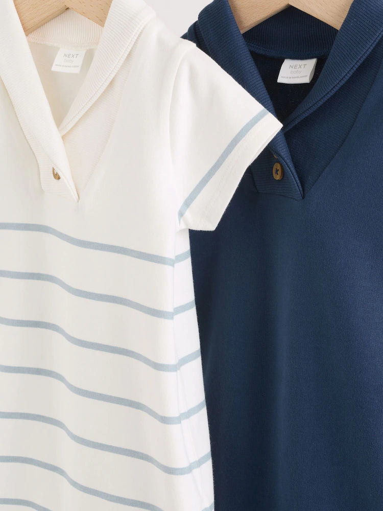 Blue and White Striped Baby Jersey Rompers 2 Pack Crafted from premium 100% cotton jersey with elastane-reinforced ribbing for optimal stretch and durability, this two-piece romper set combines comfort with practical design. The classic striped pattern suits any occasion, from playdates to family gatherings. Machine washable for effortless care, these rompers maintain their shape and softness through repeated washing. The breathable cotton construction keeps your baby comfortable throughout the day, while the elastic ribbing ensures a secure, non-restrictive fit as your child moves and grows.