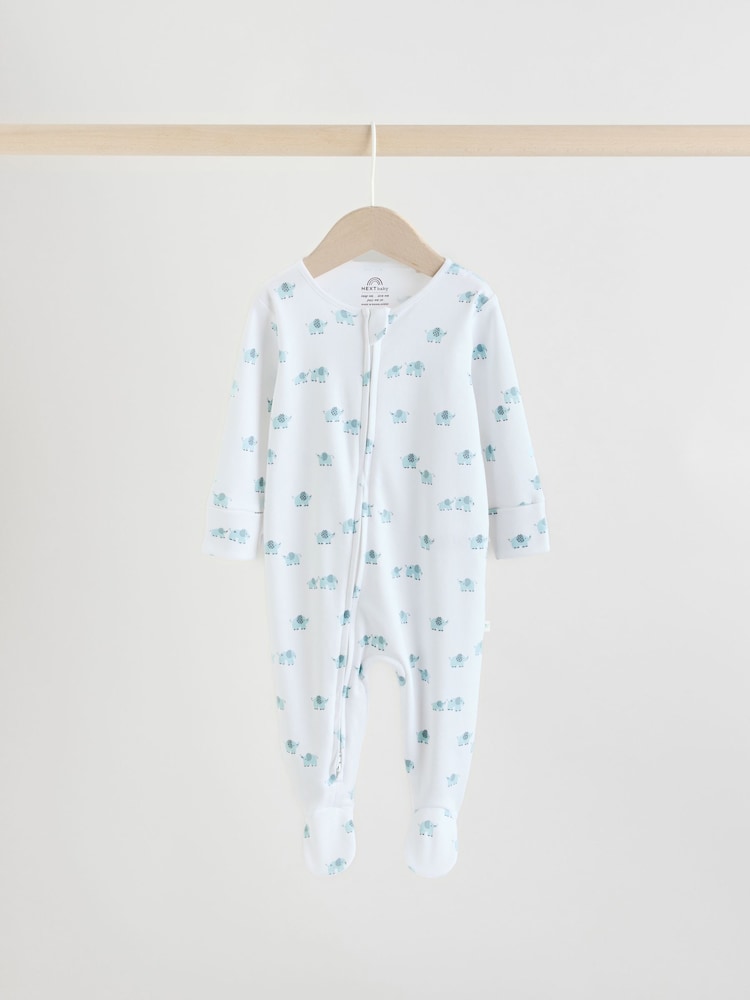 Keep your baby comfortable through the night with this essential 3-pack of blue sleepsuits. Crafted from super soft cotton, the fabric is gentle on delicate skin while the two-way zip fastening streamlines dressing and nappy changes. Each suit features turn-back scratch mitts to protect tiny hands, inner lined feet for warmth, and charming linear elephant print designs. Made without harmful chemicals or dyes, these sleepsuits are designed to grow with your child from newborn through 6 months, with anti-slip sole prints from 9-12 months. Machine washable for easy care.