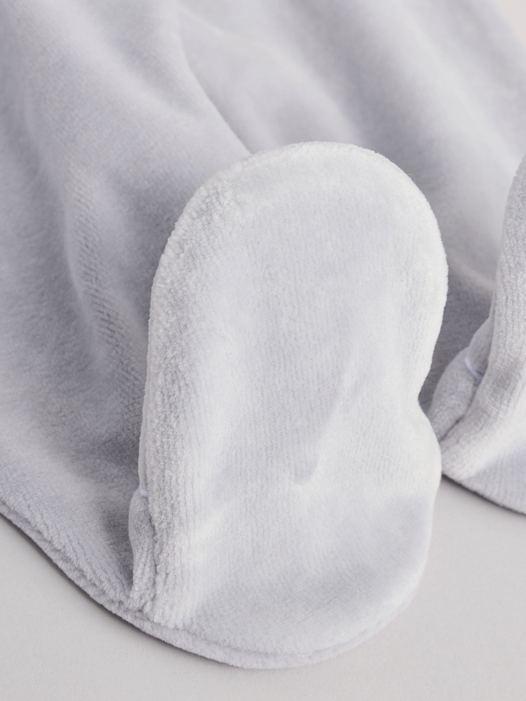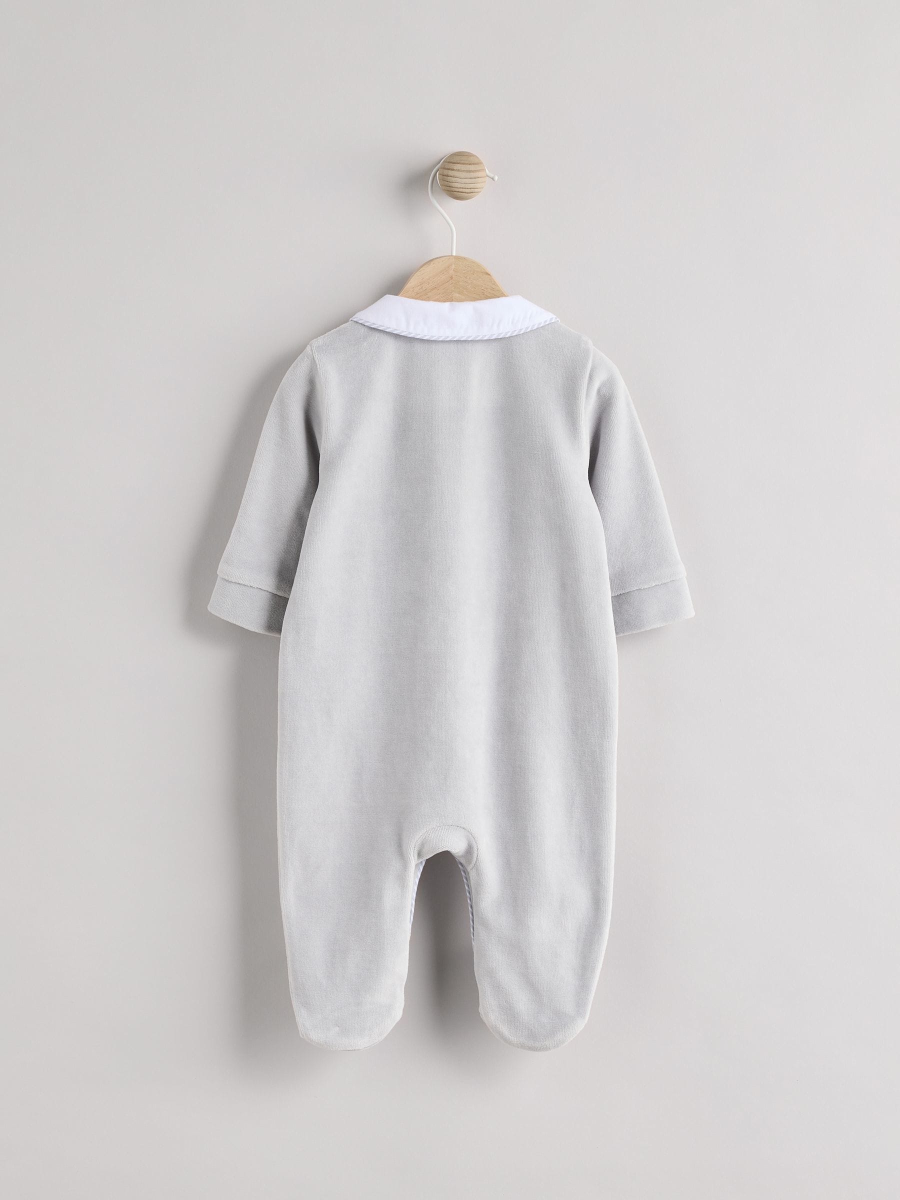 Footed sleepsuit Dinosaur embroidery Super soft velour fabric Patch pocket Long sleeves Crew neck Nickle-free popper fastenings Machine washable. 85% Cotton, 15% Polyester. Country of Origin: India Warning: Keep away from fire and flames.