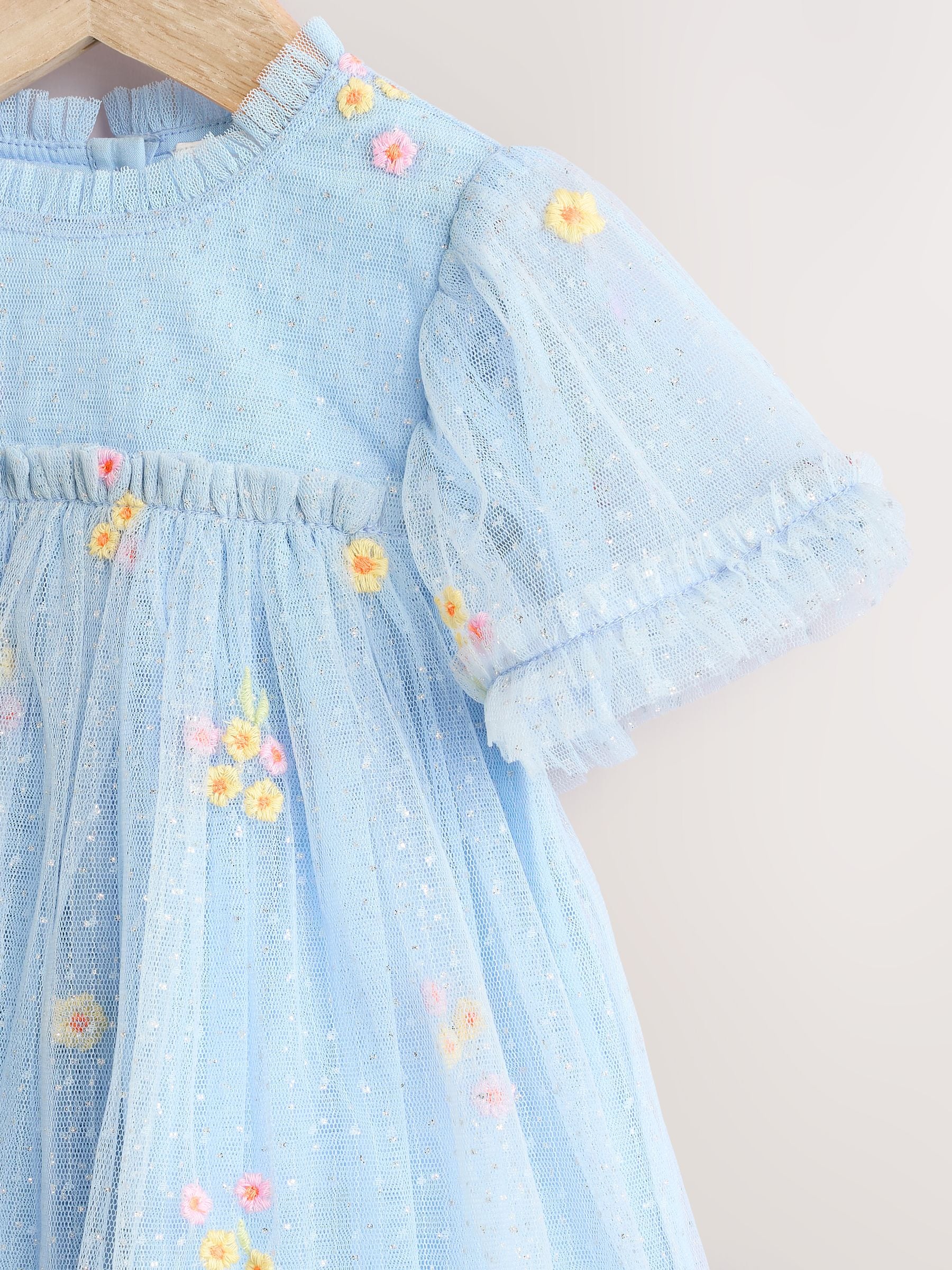 Blue Embroidered Flower Mesh Baby Dress (0mths-2yrs)