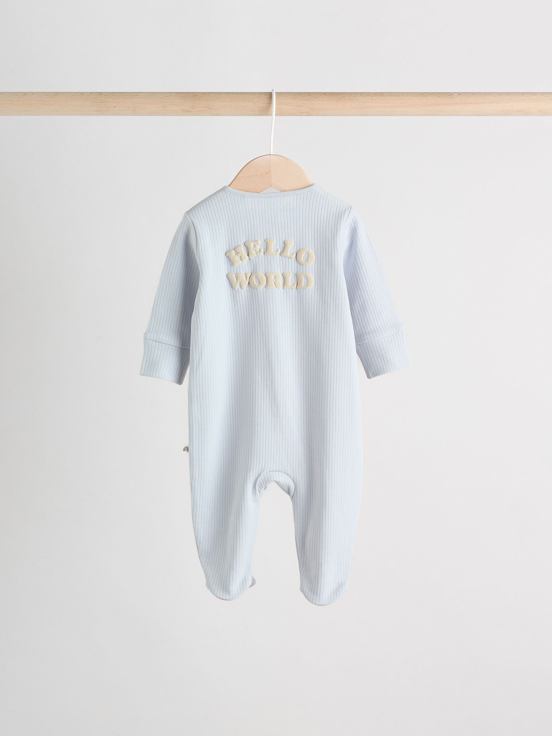 Our 3 pack of baby sleepsuits are ideal for stocking up on essenitals. Made from pure cotton, each piece is long sleeve and rib texure. The two way zip fastening makes for easy dressing with a fun slogan design on the front and back. 3 pack 100% cotton Long sleeve Slogan design Two way zip fastening Machine washable. 3 x Sleepsuit 100% Cotton. Country of Origin: India Warning: Keep away from fire and flames.