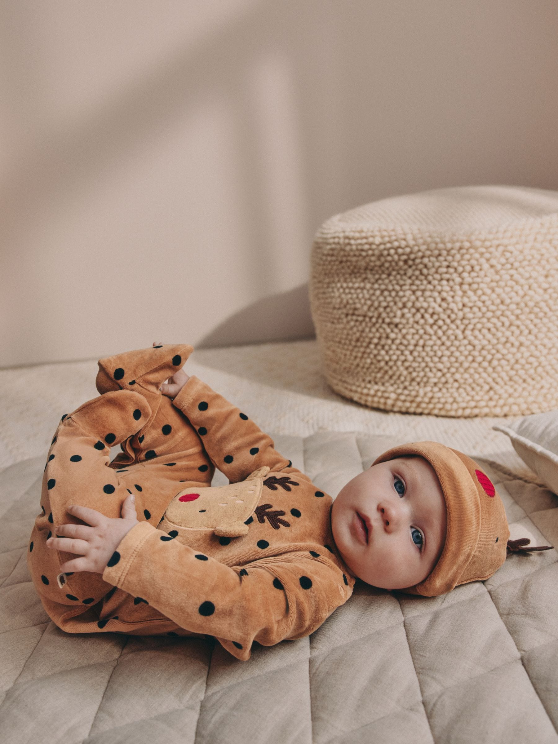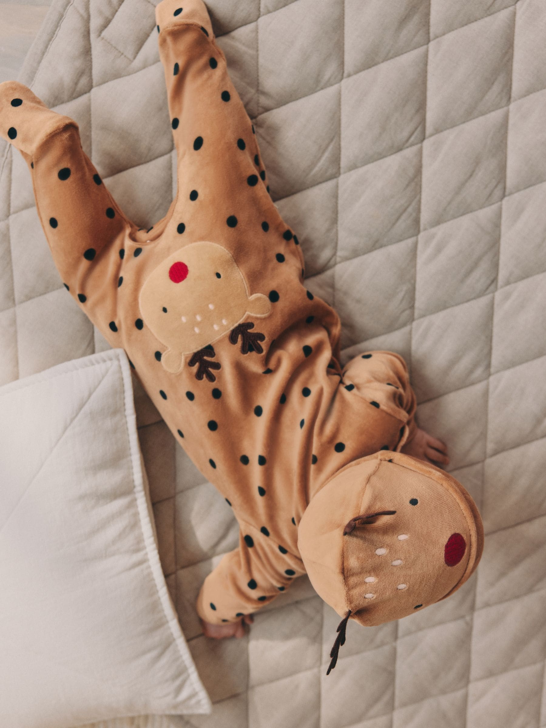 Get them ready for the festive season with this adorable brown reindeer baby sleepsuit. The soft and cosy fabric is perfect for keeping them comfortable, while the reindeer face detail and 3D antlers add a fun, festive touch. This set includes a matching hat to complete the look. 2 piece sleepsuit and hat set Popper fastening Inner lined feet Anti-slip sole print from 9-12 months No harmful chemicals or dyes Nickel-free poppers Cosy fabric Machine washable. Sleepsuit and Hat 80% Cotton, 20% Recycled polyester. Country of Origin: India Warning: Keep away from fire and flames.