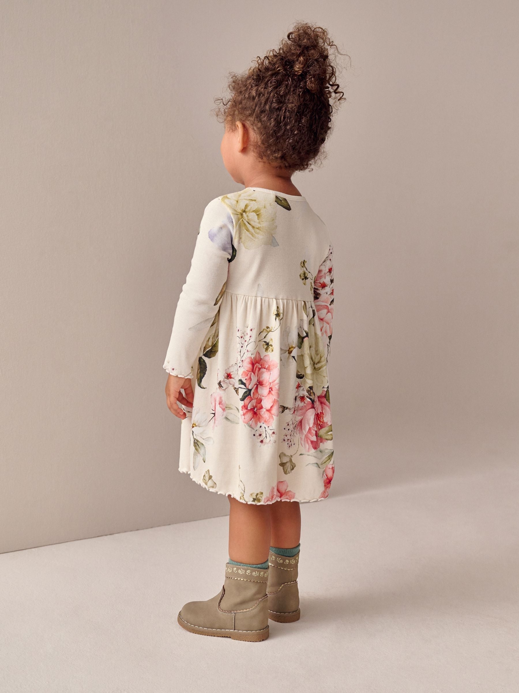 Cream Floral Long Sleeve Ribbed Dress (3mths-7yrs)