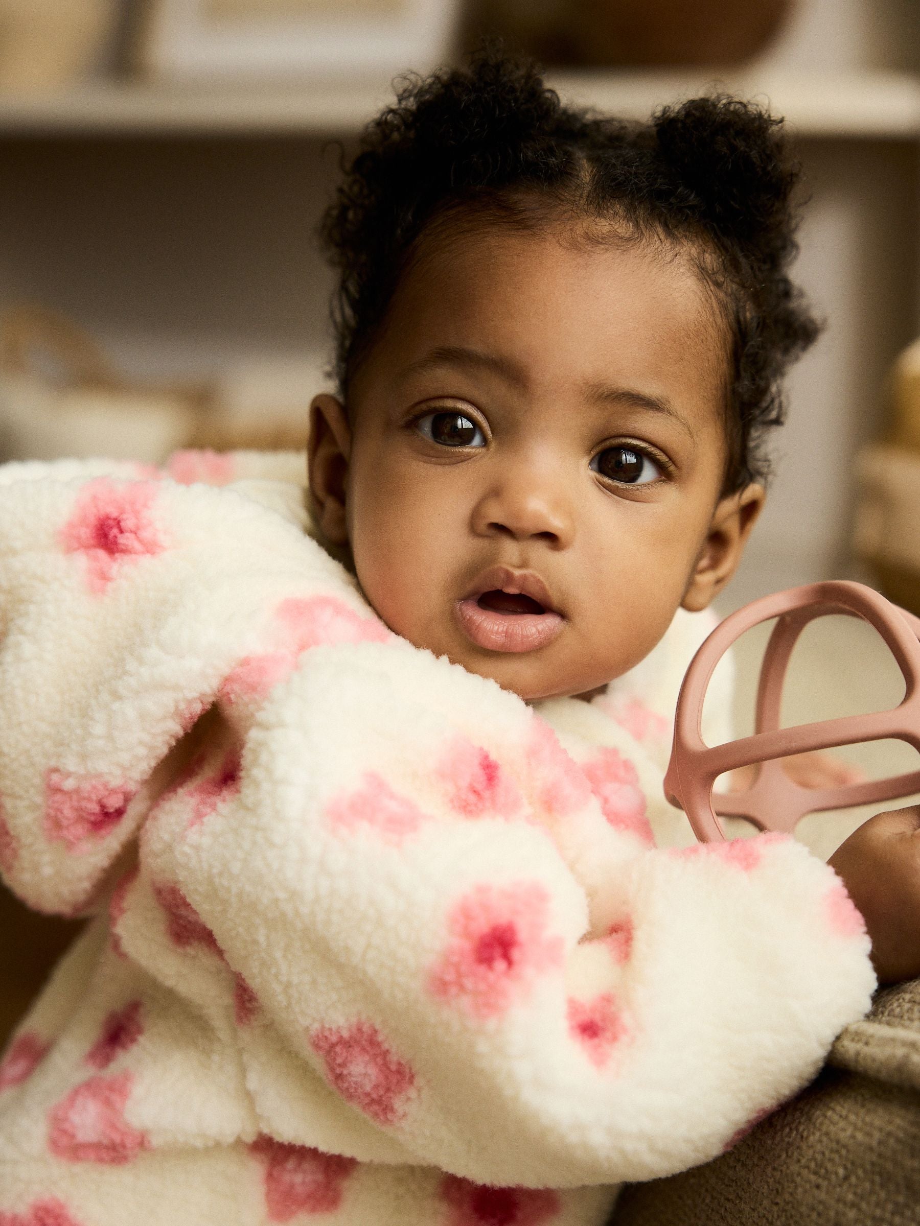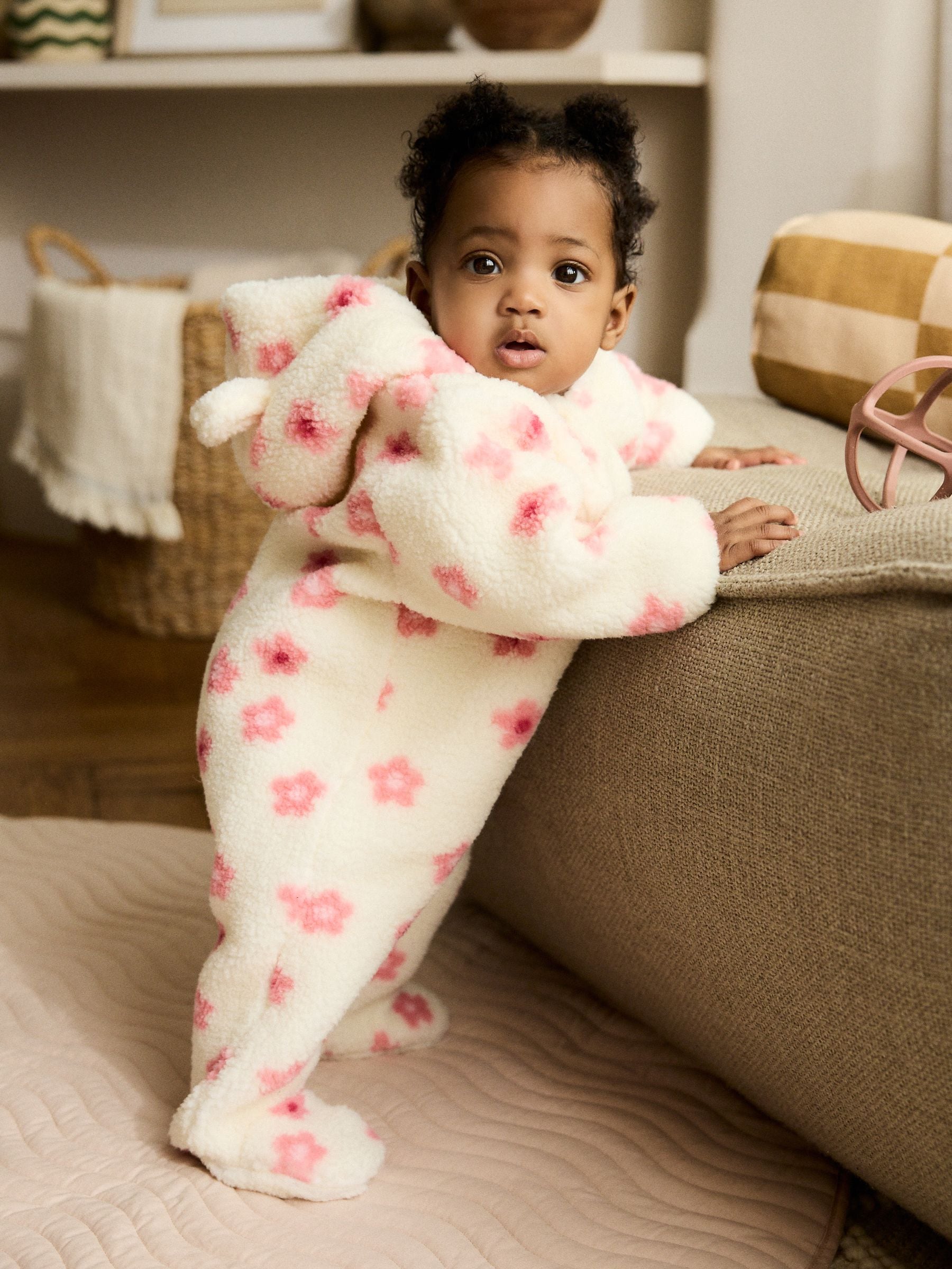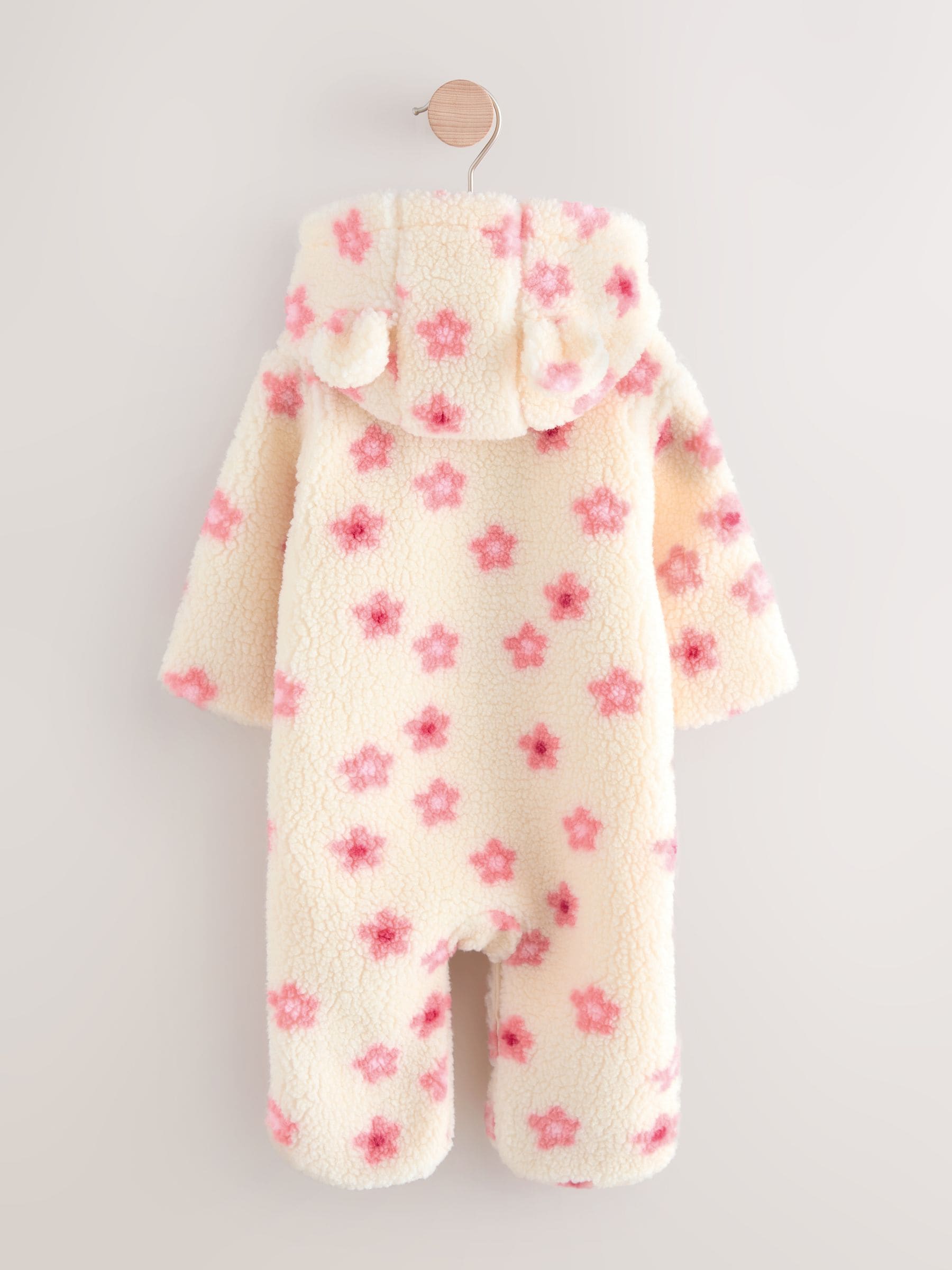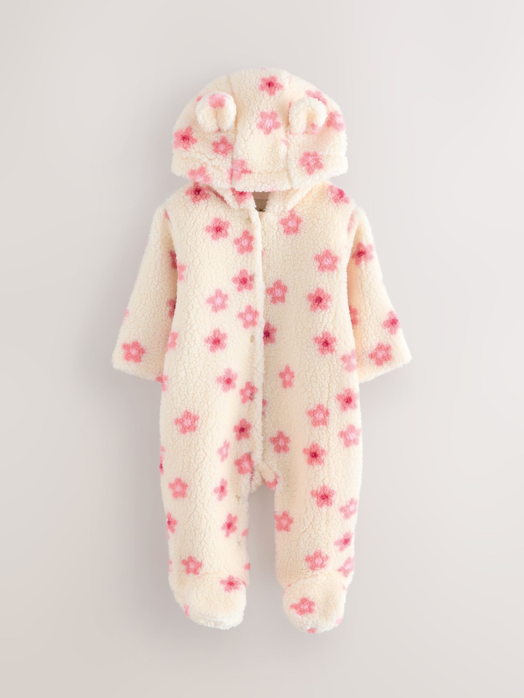 Ecru and Pink Floral Baby Borg Hooded Pramsuit (0mths-2yrs)