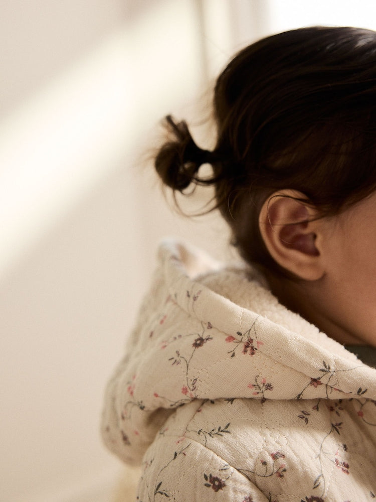 Keep your little one cozy and stylish with this charming floral baby coat. Crafted from soft cotton with a delightful crinkle texture, it features a warm borg lining and protective hood for unpredictable weather. Practical popper fastening and handy pockets make dressing easy, while the machine-washable design suits busy parents. Made with recycled polyester lining and wadding for eco-conscious comfort.