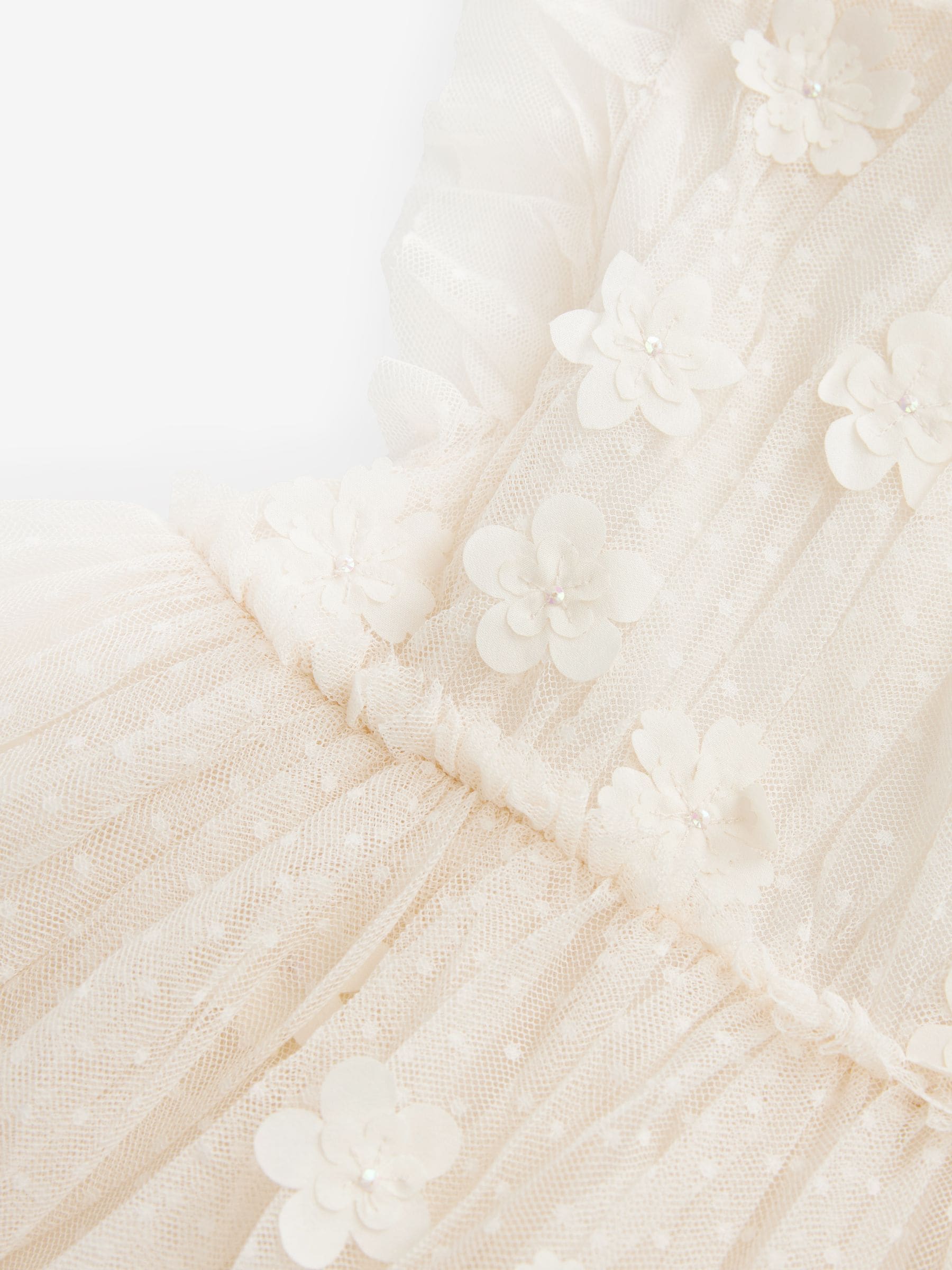 This gorgeous ecru white flower girl dress has a tiered mesh construction with 3D flower detailing, a floaty shape and a comfortable cotton lining, finished with frilled short sleeves. Regular fit Mesh construction 3D flower detailing Floaty shape Frilled short sleeves Cotton lining Main 100% Recycled polyester. Inner 100% Nylon. Lining 100% Cotton. Country of Origin: India