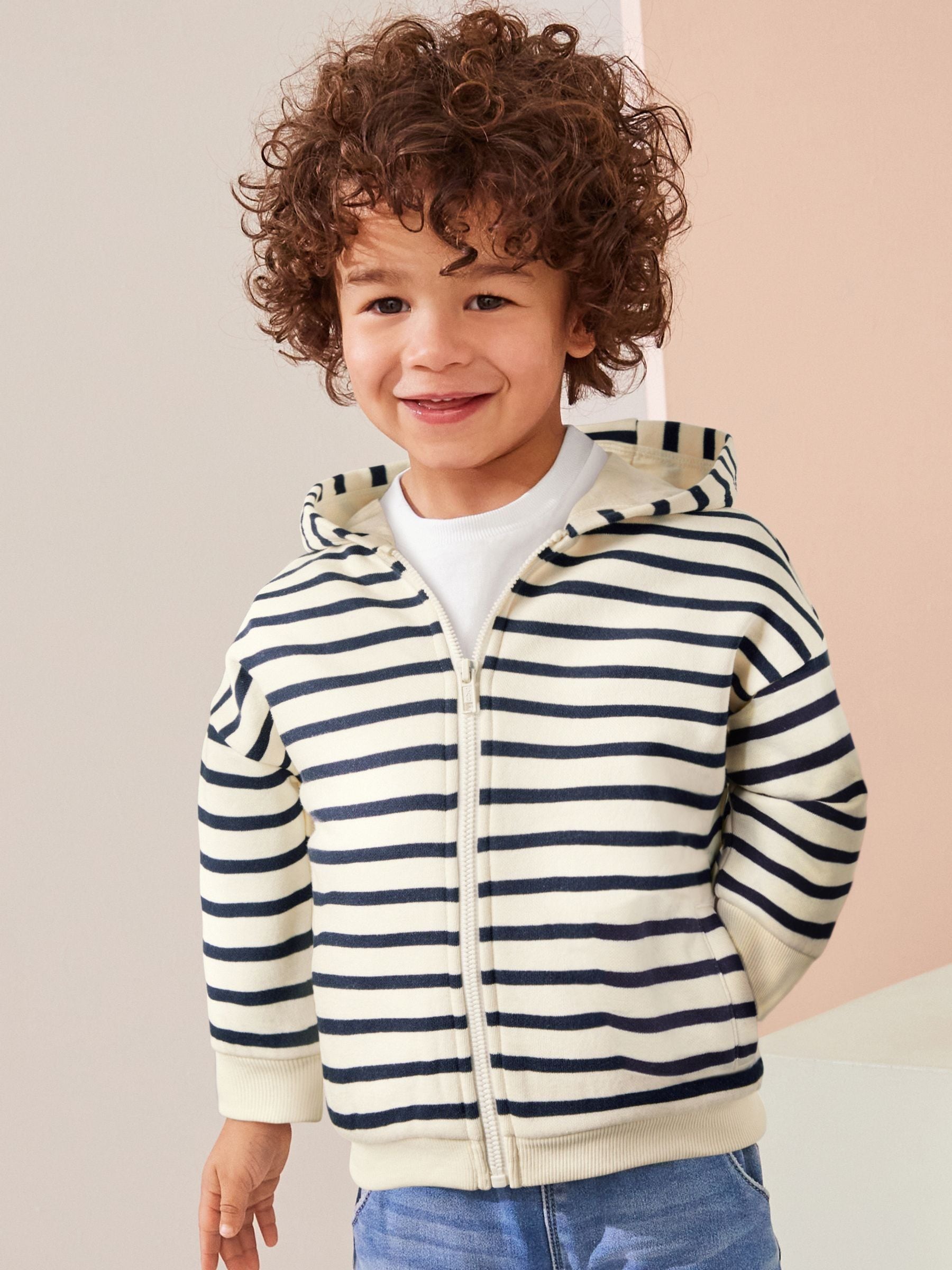 Your little dude will love this ecru white and navy blue stripe cotton-rich jersey fabric hoodie, featuring a full zip fastening, a set-in hood and dropped shoulders, finished with dual side pockets and ribbed hems. Regular fit Cotton-rich fabric Zip fastening Set-in hood Drop shoulders Side pockets Ribbed hems Machine washable. 80% Cotton, 20% Recycled polyester. Country of Origin: Bangladesh
