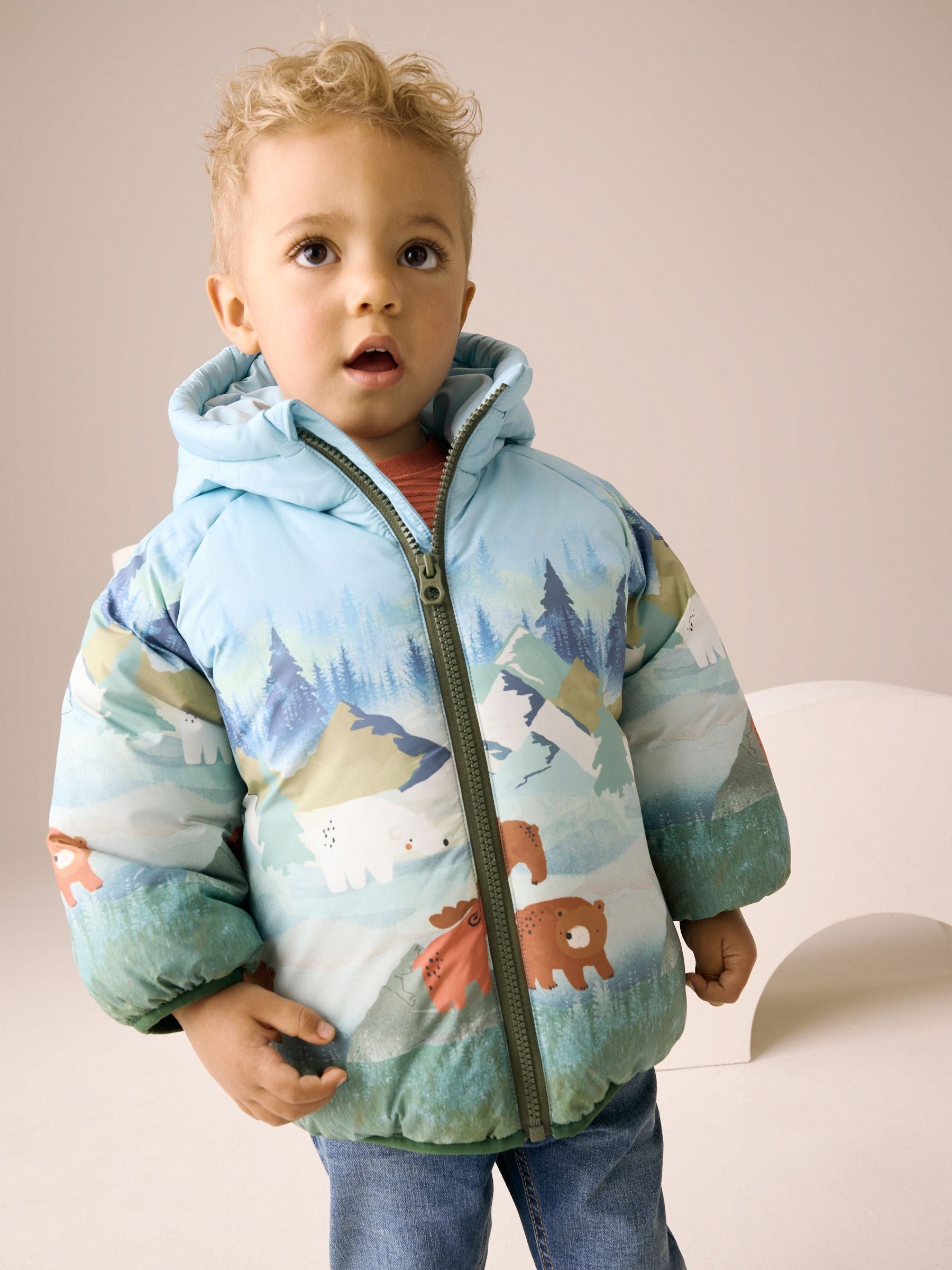 Bundle up your little adventurer in this cosy Green Scene Print Padded Coat. This delightful jacket features a unique, all-over print showcasing a charming bears in the mountains scene in shades of blue and green. Designed for reliable outdoor wear, it is shower resistant and wadded for extra warmth. The coat includes a practical full zip fastening, a cosy hood for maximum coverage, and convenient side pockets for small treasures. Shower resistant Side pockets Wadded for extra warmth Machine washable. Main 100% Recycled polyester. Lining 100% Recycled polyester. Wadding 100% Recycled polyester. Country of Origin: Myanmar