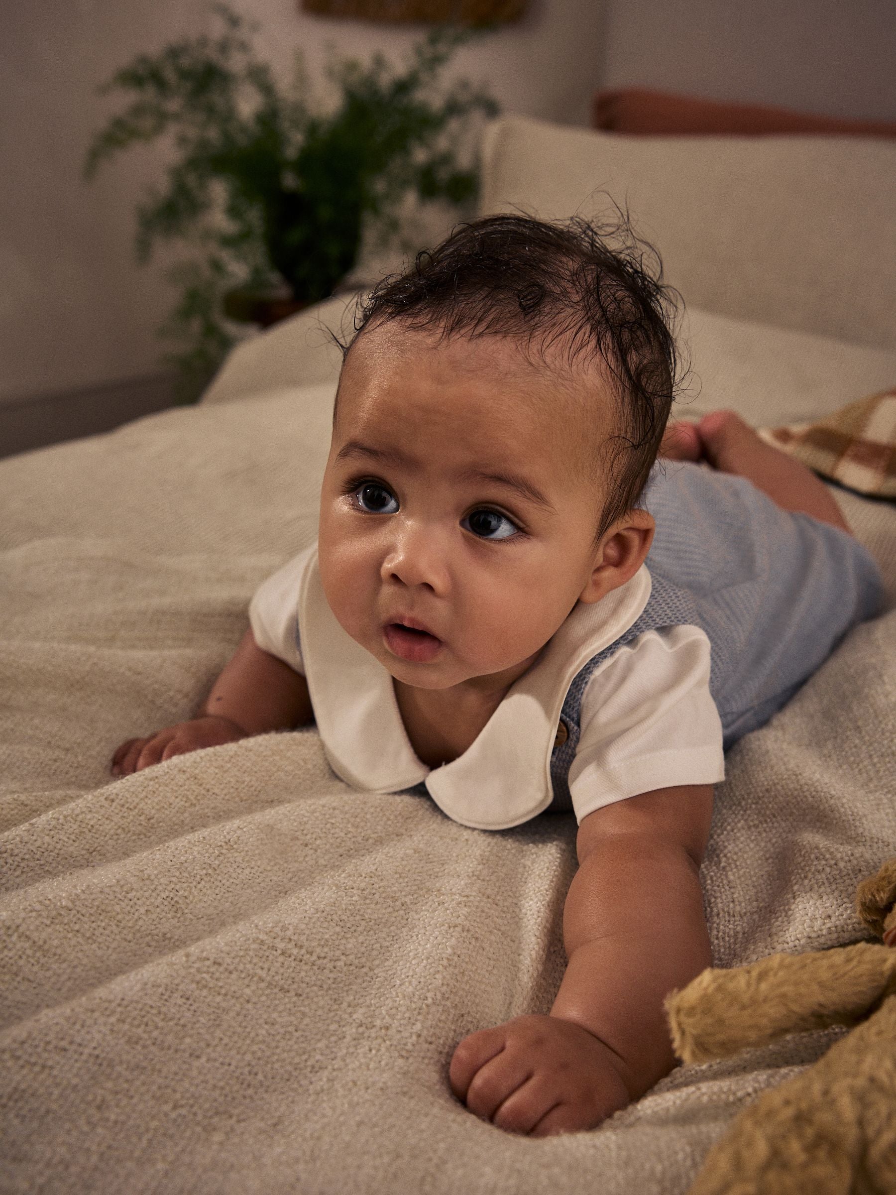 With this 3 piece set your little one is ready for any occasion. Made up of a soft woven dungaree and 100% cotton bodysuit with a cute rounded collar. This set also includes a cute pair of socks to finish the look. 3 piece set Woven dungaree 100% cotton bodysuit Collar detailing Matchig socks Machine washable. Dungaree 98% Cotton, 2% Elastane. Bodysuit 100% Cotton. Socks 73% Cotton, 24% Nylon, 3% Elastane. Country of Origin: Sri Lanka Warning: Keep away from fire and flames.