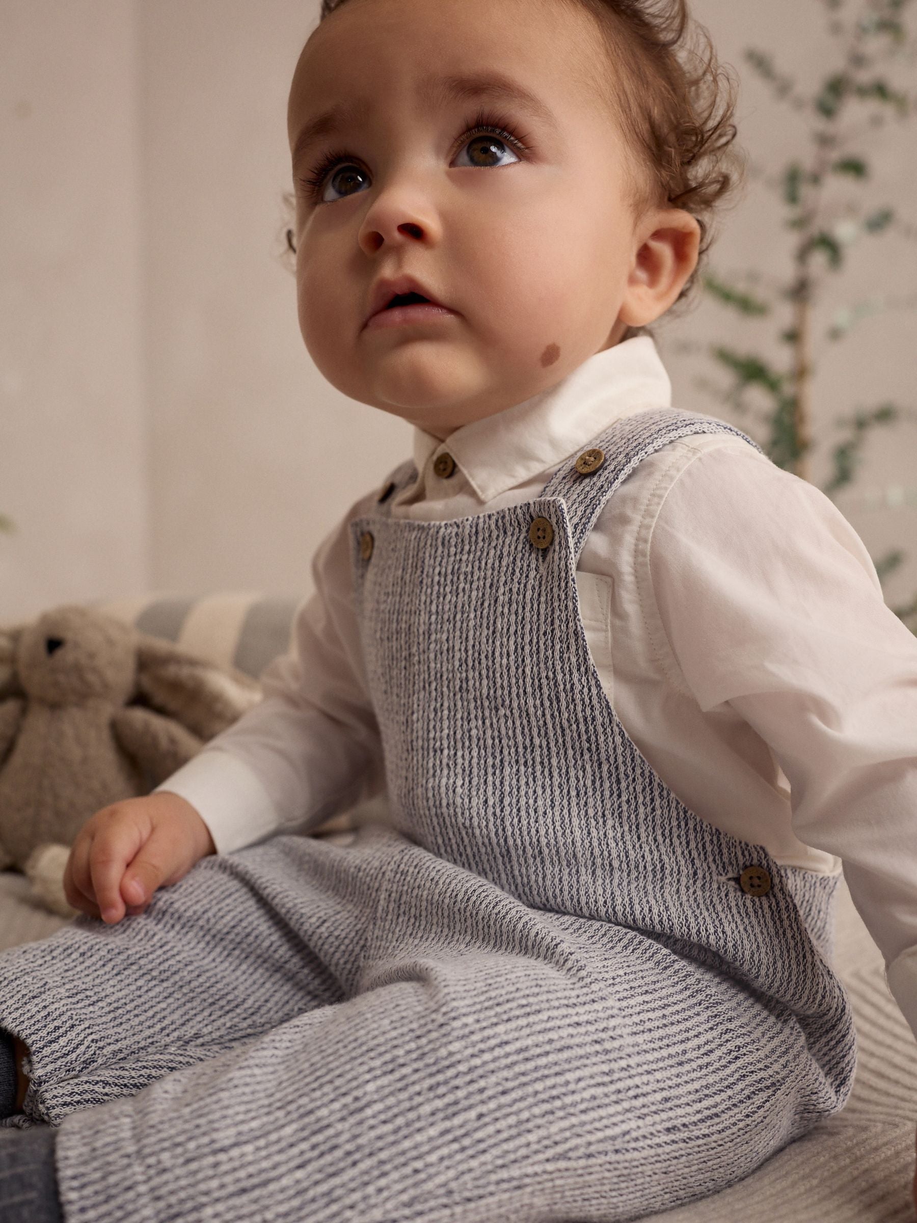 This 2-piece set is made up of a soft cotton woven ticking stripe dungaree, paired with a cotton rich white shirt bodysuit with popper fastening. 2 piece set 100% cotton Grey stripe dungarees White bodysuit Machine washable. Dungaree and Bodysuit 100% Cotton. Country of Origin: India Warning: Keep away from fire and flames.