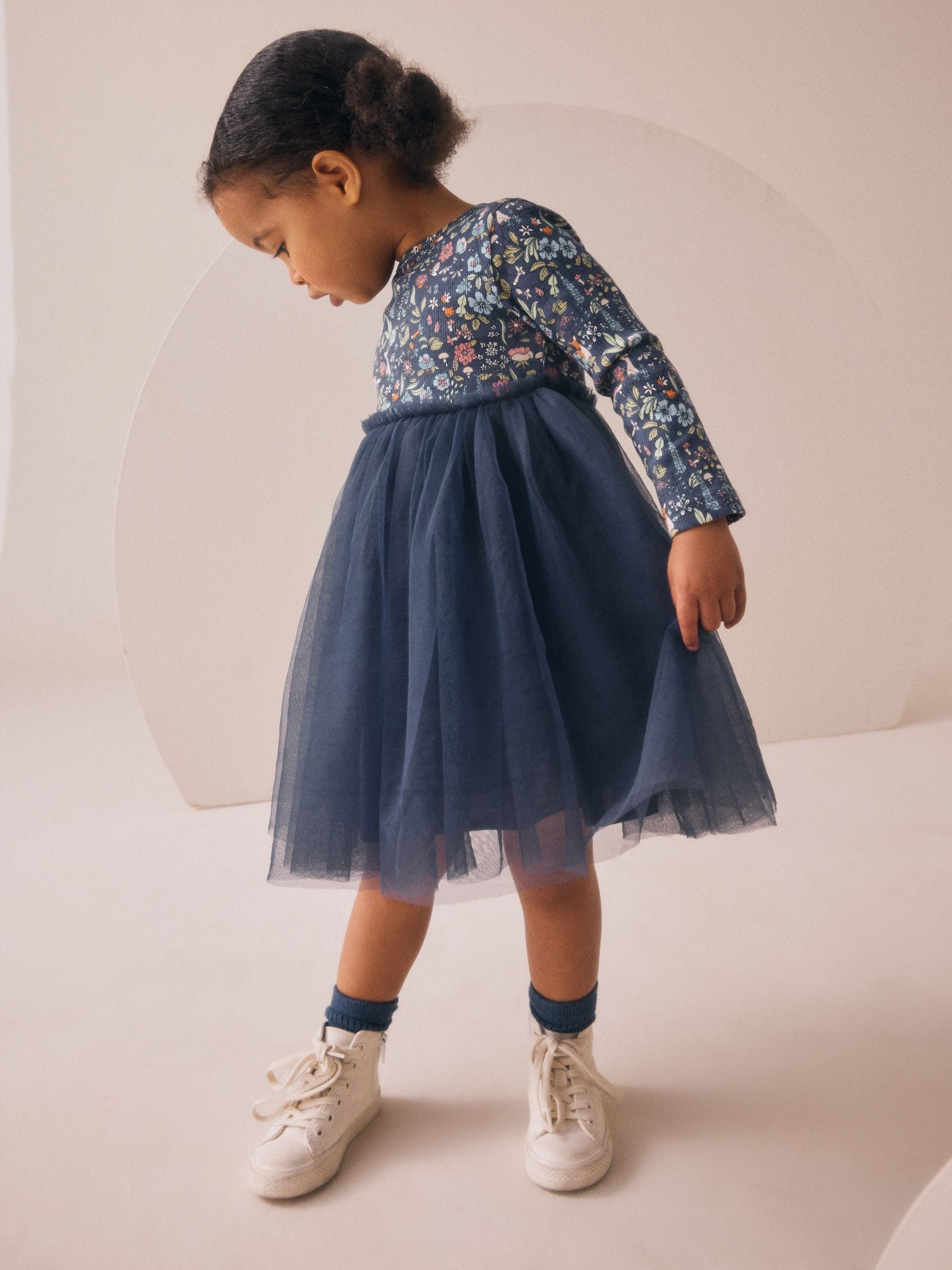 Elevate her party wear with the enchanting party dress, designed for stylish young wardrobes. This relaxed fit garment features a sparkle mesh skirt and an embroidered motif for an effortless throw-on style perfect for special occasions. motif detail Embroidered motif design Long sleeves Features sparkle mesh overlay Soft jersey and mesh fabric Machine washable. Main 95% Cotton, 5% Elastane. Mesh 100% Nylon. Lining 100% Cotton. Country of Origin: Bangladesh