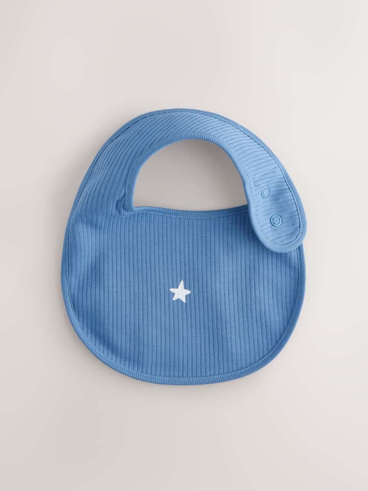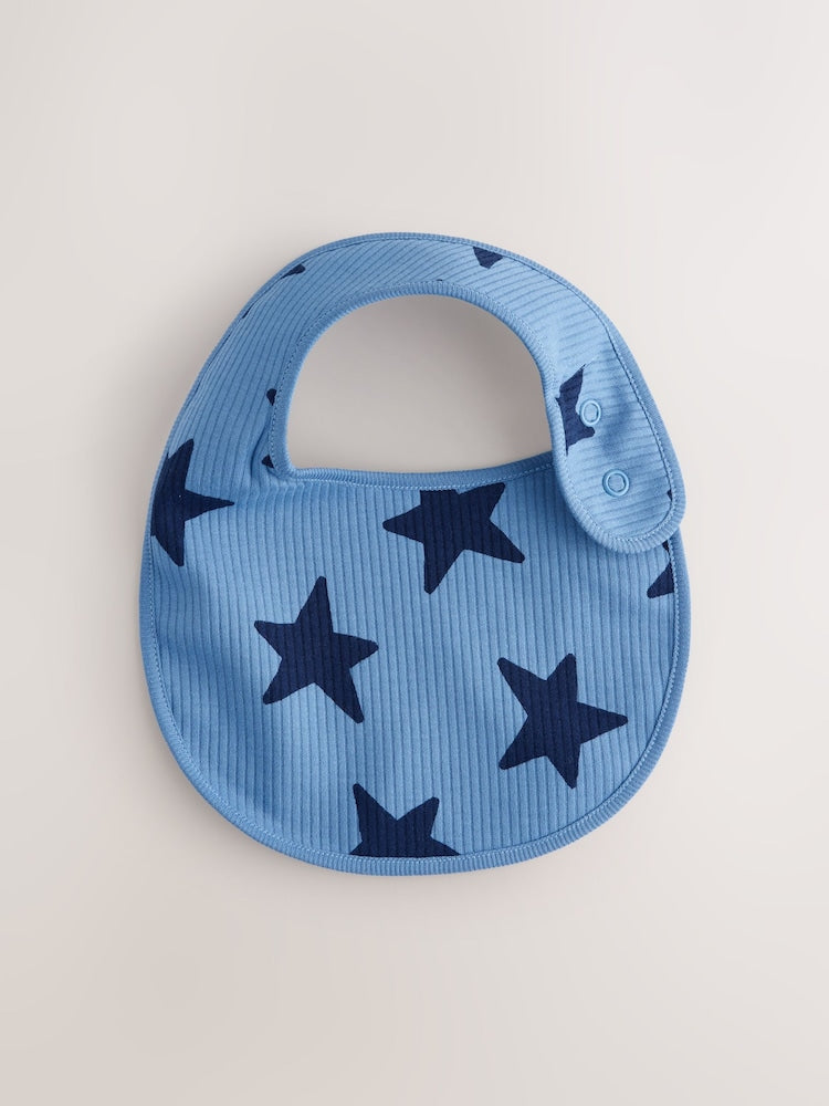 Keep messes to a minimum with this practical Navy Star 5 pack of baby bibs. Each bib features a secure popper fastening and a charming star design. Made from soft cotton with a dribble proof layer, these bibs are both absorbent and comfortable for your little one during feeding or teething.