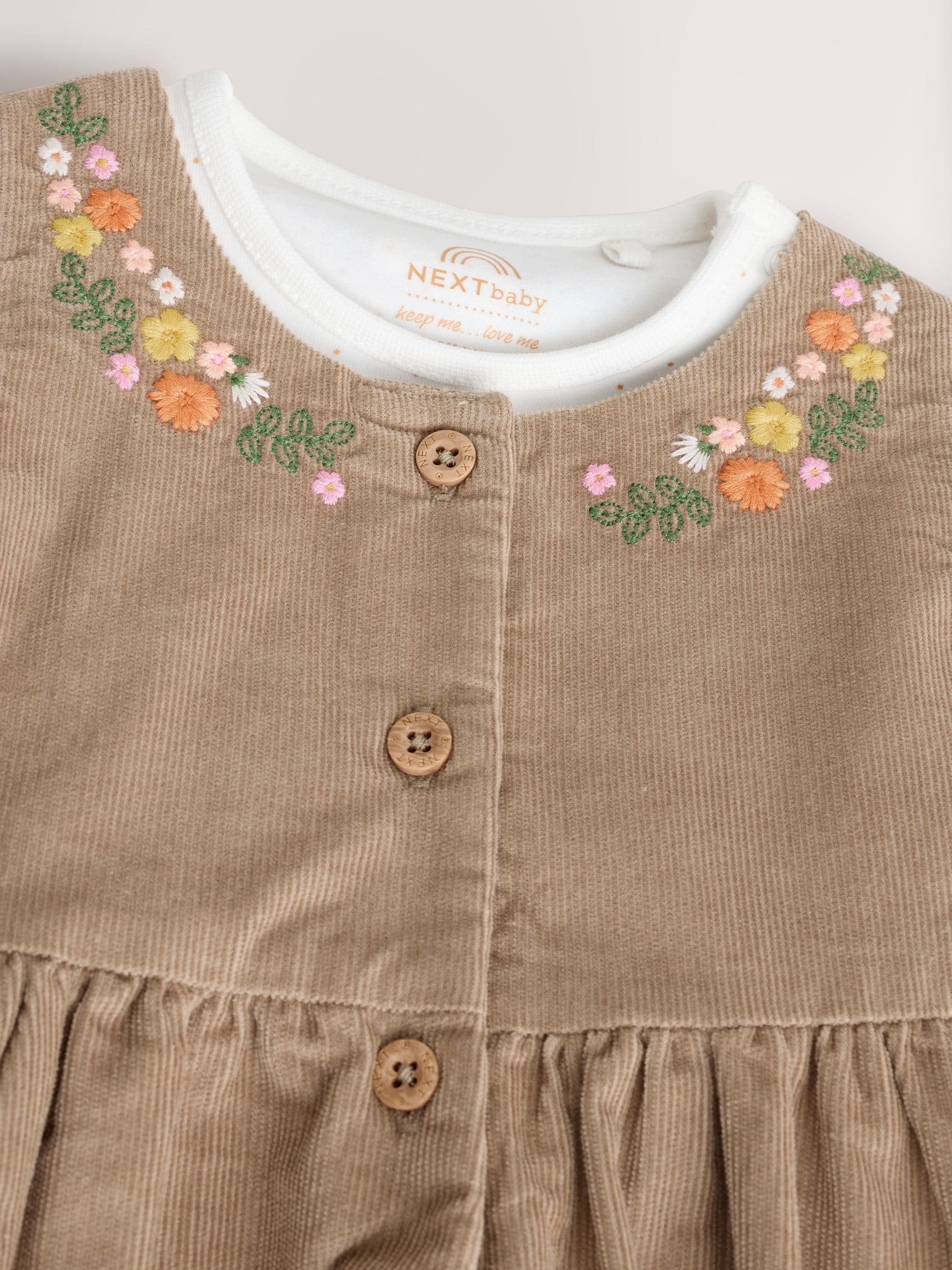 This 3-piece set is a pretty addition to their everyday wardrobe, featuring a long sleeve bodysuit with a press-stud fastening, a pinafore style dress with a cord texture and floral embroidery. Tonal tights finish the set, in a cosy knitted fabric. 3-piece set Long sleeve top Pinafore dress Floral embroidery Tonal tights Machine washable. Bodysuit 95% Cotton, 5% Elastane. Dress Main 100% Cotton. Lining 100% Cotton. Tights 76% Cotton, 22% Nylon, 2% Elastane. Country of Origin: India Warning: Keep away from fire and flames.
