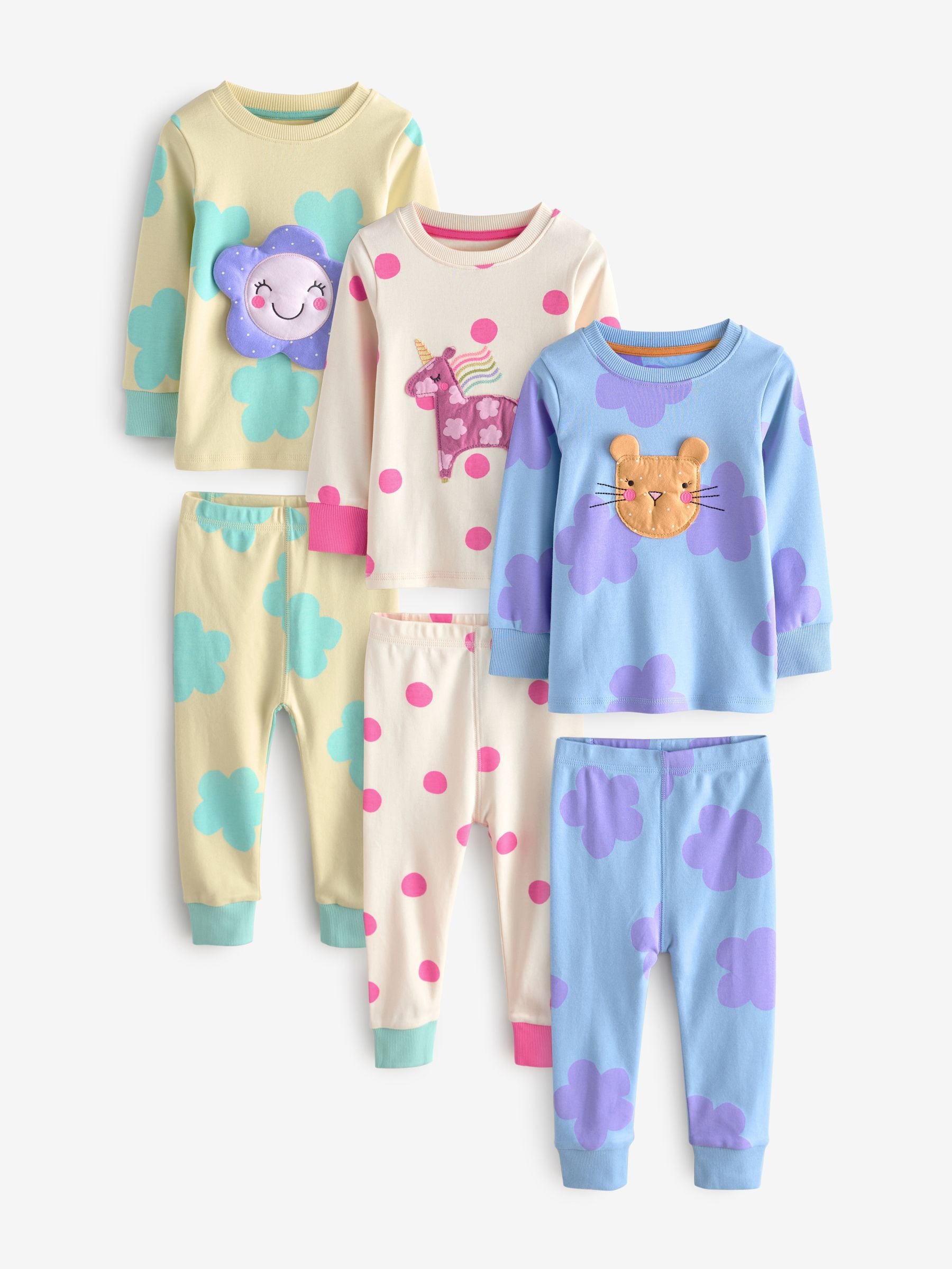 Pastel Cat/ Unicorn/ Flower Long Sleeve Snuggle Pyjamas 3 Pack (9mths-16yrs)