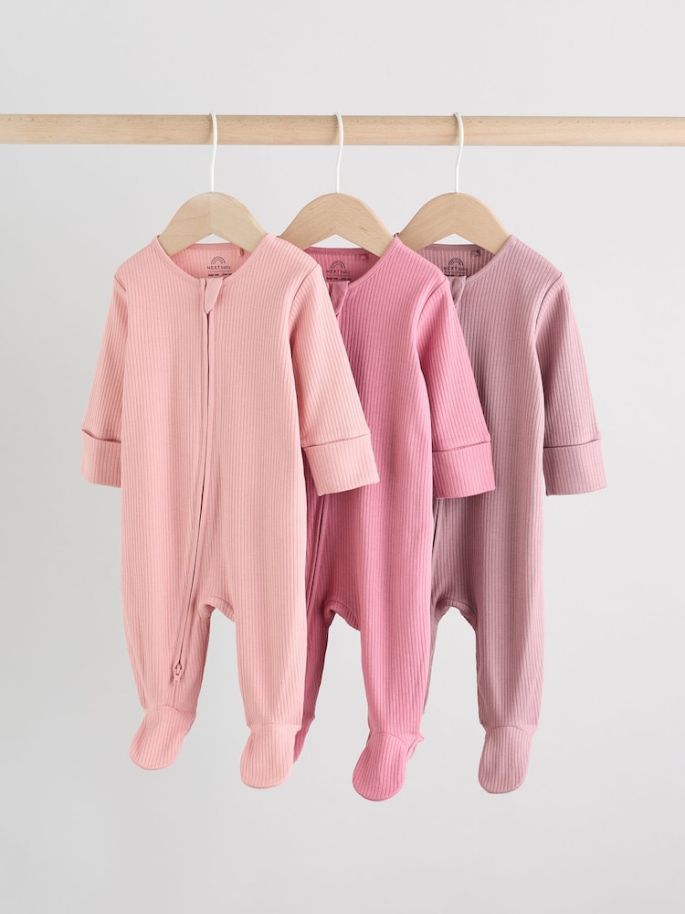 Pink 3 Pack Two Way Zip Baby Sleepsuits (0-2yrs)
