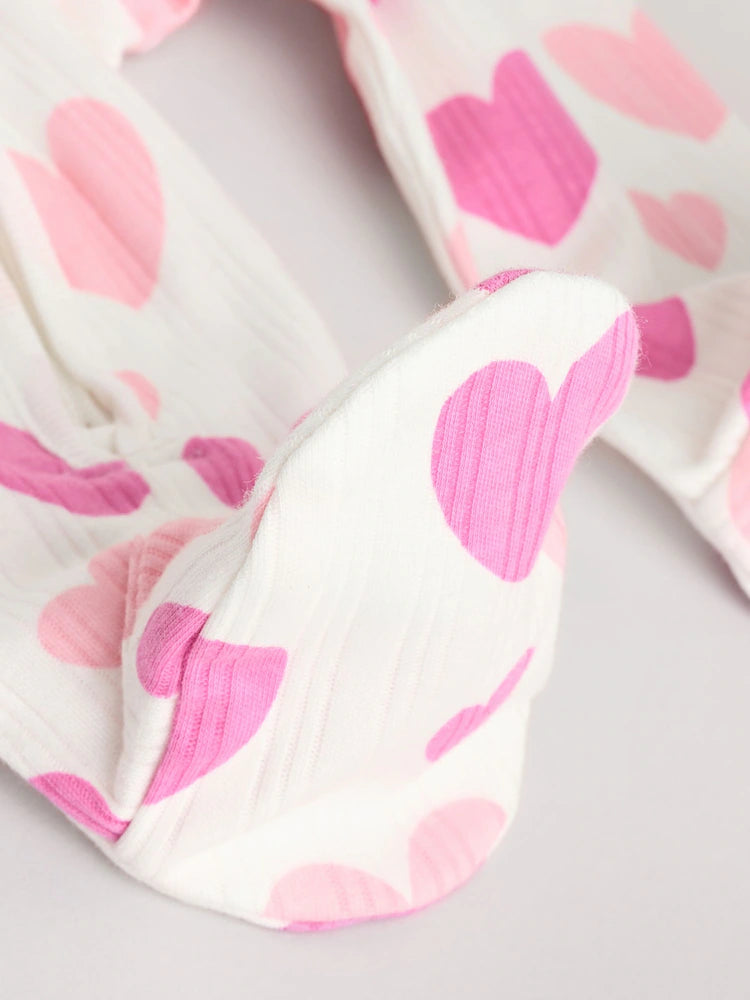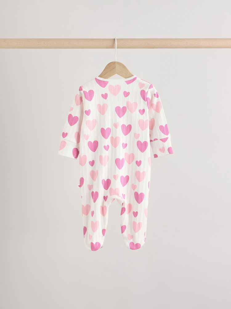 This 3-pack of sleepsuits have pops of pink tonal hues with heart and star prints, made from pure cotton with a 2-way zip fastening for easy dressing, turn-back scratch mitts up to 3-6 months and anti slip soles on the inner lined feet from 9-12 months.