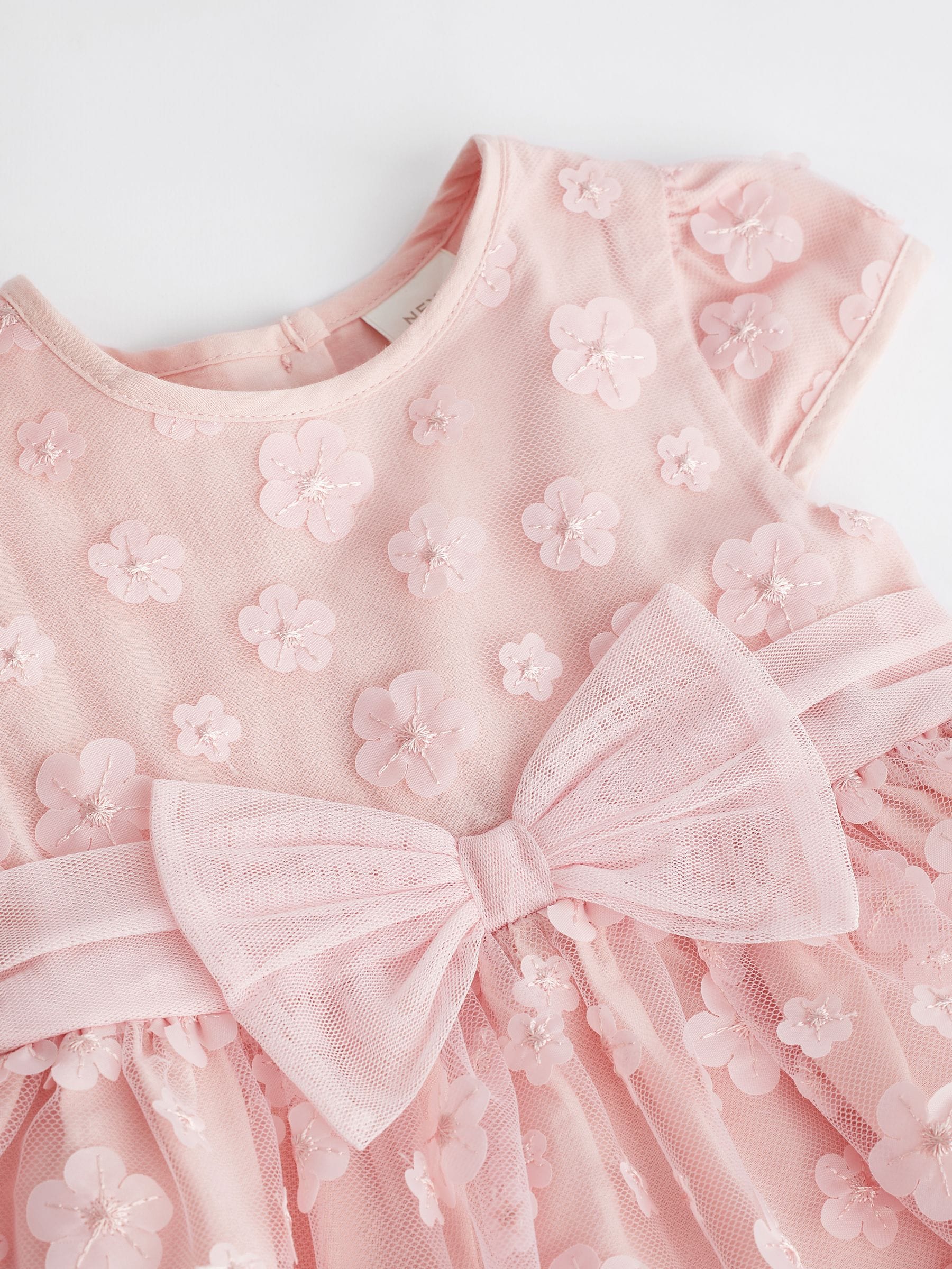 This gorgeous pink dress is perfect for special occasions, crafted from a mesh design with 3D flower detailing, a front bow and a comfortable cotton lining, finished with a button-up fastening for easy changing. Mesh construction 3D flower design Bow detailing Cotton lining Button fastening Machine washable. Main 100% Polyester. Lining 100% Cotton. Mesh 100% Polyester. Country of Origin: Morocco Warning: Keep away from fire and flames.