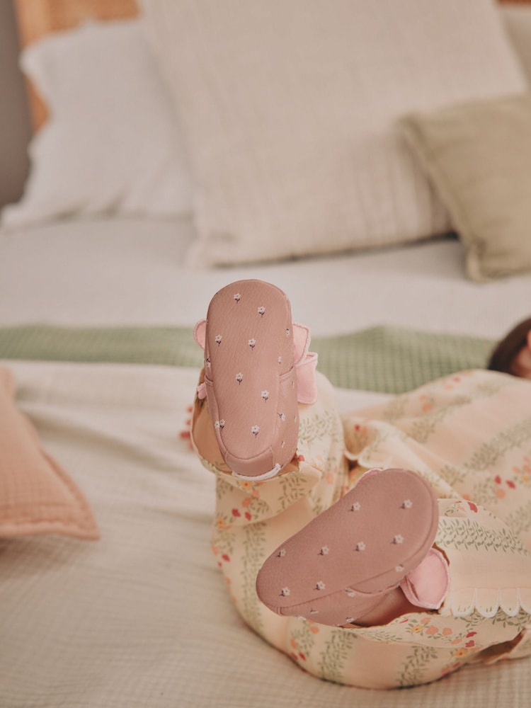 Introduce your little one to comfort and style with these charming baby boots featuring a soft faux leather upper adorned with delicate floral prints. The playful fabric bow and woven back tab with "Happy" slogan add personality to every step. Designed with a breathable textile lining to keep tiny feet cozy and dry, these boots are finished with a gentle, flexible sole perfect for developing feet. Ideal for babies aged 0-18 months, they combine practical comfort with adorable design that parents will love.