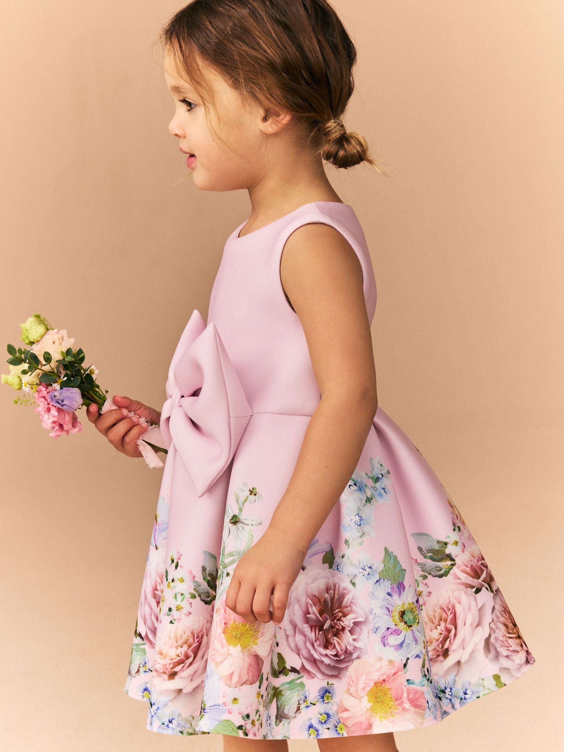 Made from a stretchy scuba fabric, this pretty pink party dress is great for special occasions and wedding receptions, featuring floral graphic prints and oversized bow detailing, finished with a button fastening to the back. Stretchy scuba fabric Sleeveless Floral print Bow detailing Button fastening Machine washable. Main 91% Recycled polyester, 9% Elastane. Lining 100% Recycled polyester. Country of Origin: Morocco