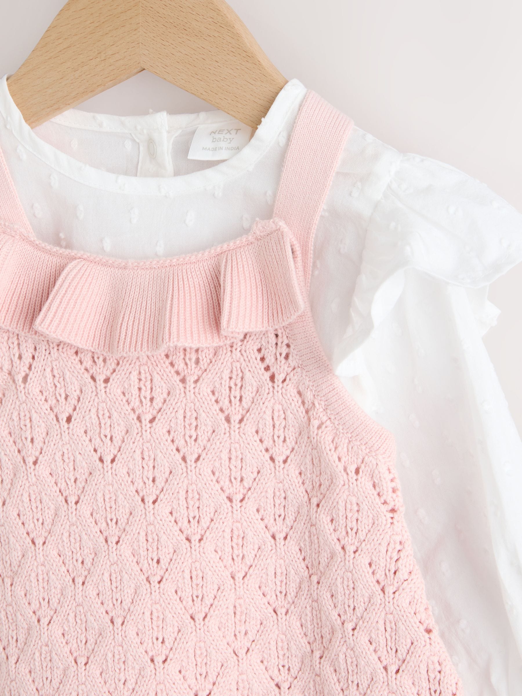 Pink/ White Baby Romper and Knitted Dungarees with Tights 3 Piece Set (0mths-2yrs)