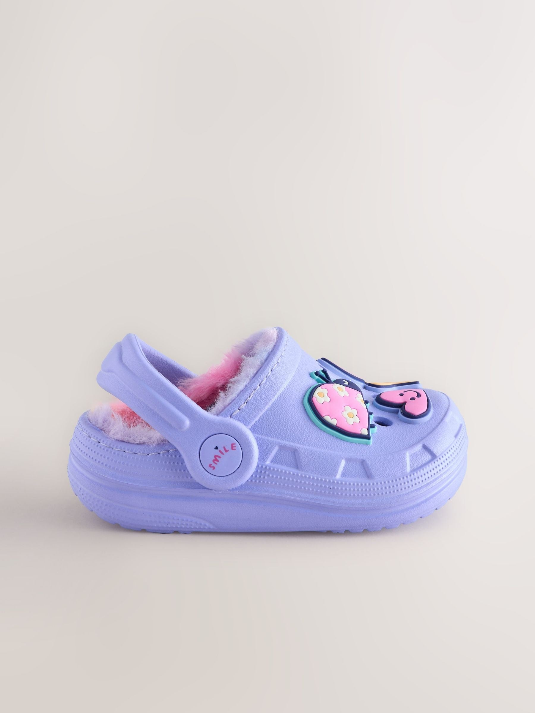 Perfect for keeping little feet warm and cosy, these fun purple clog slippers feature a snug fleece lining and easy slip-on style. The decorative charms and a movable back strap make them a playful and secure choice for all their indoor adventures. Cosy fleece lining Slip on style Back strap for easy fitting Decorative charms Upper - Other Materials, Lining & Sock - Textile, Sole - Other Materials. Country of Origin: China