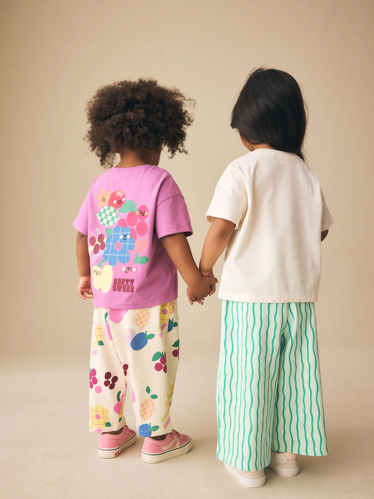 This cheerful Purple/Green Top & Trousers Set is a versatile 4 piece set pack for her casual wardrobe. Featuring a back graphic on the tops, the set includes two pairs of trousers in barrel and wide leg trouser styles, both with comfortable short sleeves.