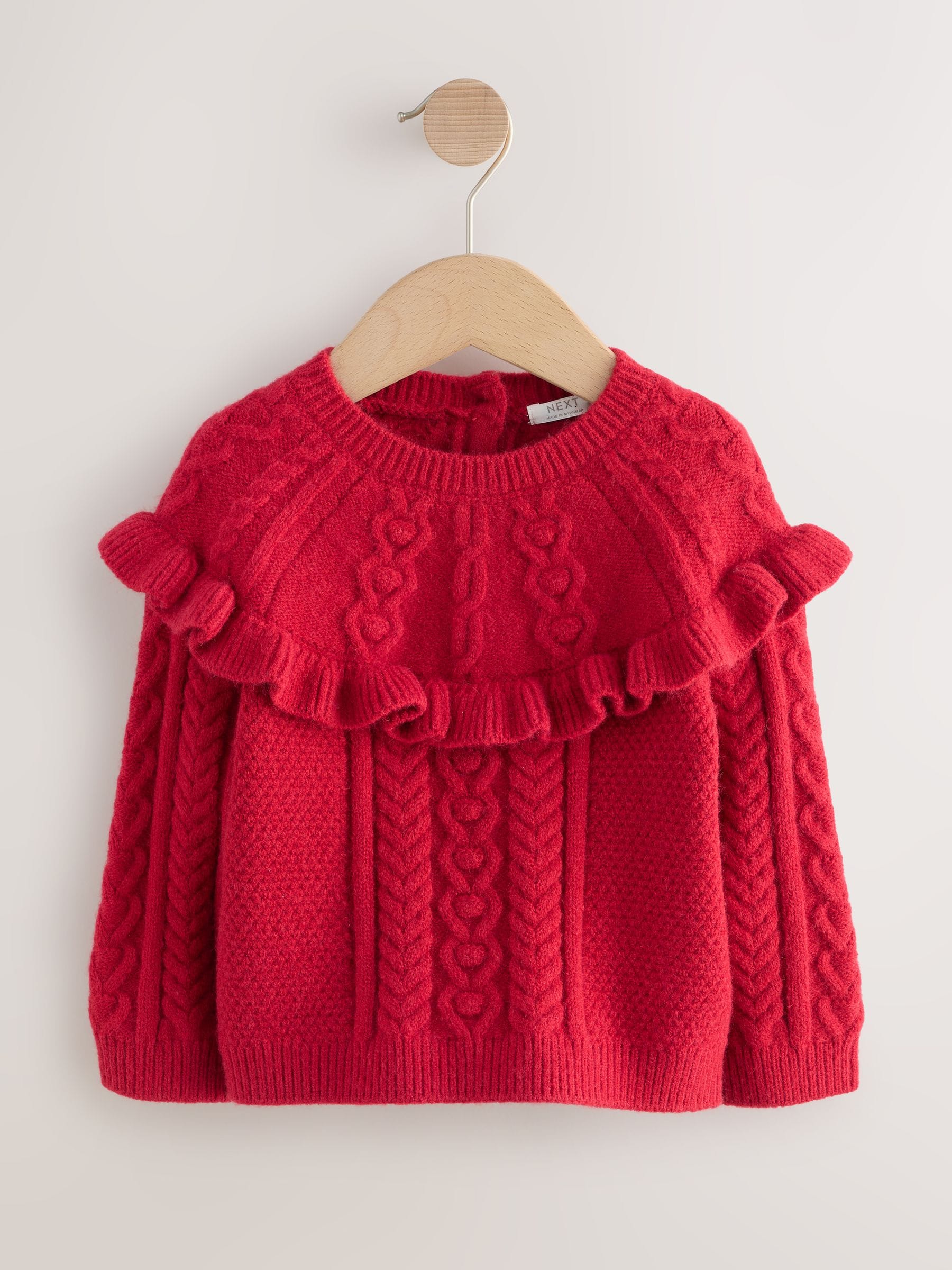 The jumper is an Intricate cable knit, incorporating a mix of vertical cables and diamond patterns on the body and sleeves, giving it a classic, cosy feel. The most distinguishing feature is the large, decorative ruffle that runs across the shoulders and chest like a yoke, adding a whimsical and sweet touch 42% Acrylic, 30% Nylon, 28% Polyester. Country of Origin: Myanmar