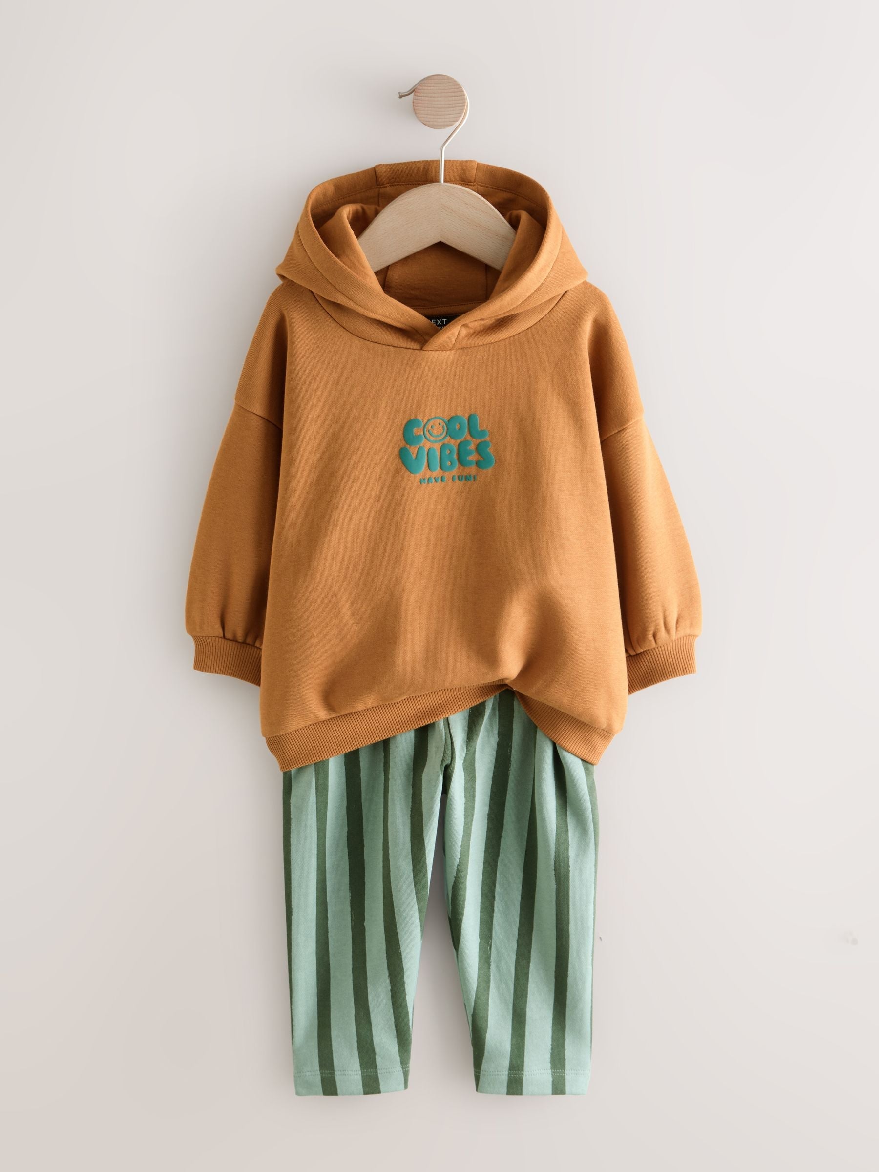 He'll be set for laid-back days in this stylish hoodie and jogger set. The cosy hoodie features a 'cool vibes' print to the front and back of the design for a fun touch, while the joggers feature an elasticated waist to ensure a comfortable and secure fit. 'Cool vibes' graphic Back print Elasticated waist Machine washable. Sweater 80% Cotton, 20% Recycled polyester. Jogger 100% Cotton. Country of Origin: Bangladesh