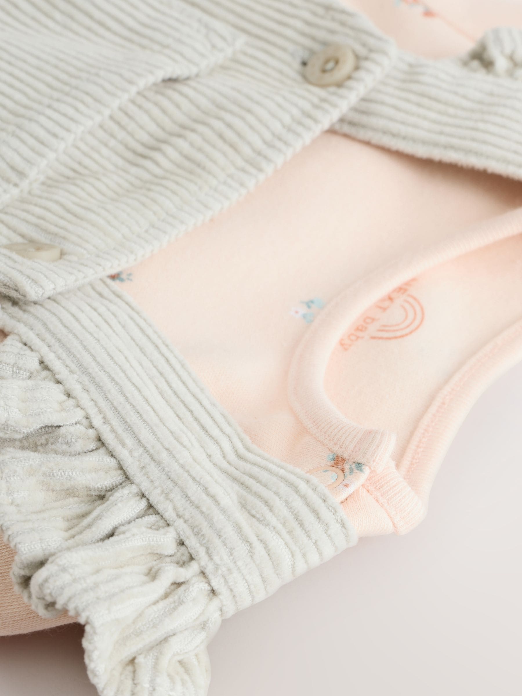 This adorable 2-piece set features a long sleeve bodysuit made from pure cotton with ruffle sleeve cuffs and knitted detailing, alongside a pair of corduroy dungarees with ruffle shoulder detailing and a selection of different colours and prints. 2-piece set 100% cotton Long sleeve bodysuit Ruffle sleeve cuffs Cord dungarees Ruffle shoulders Machine washable. Bodysuit 100% Cotton. Dungaree Main 100% Cotton. Lining 100% Cotton. Country of Origin: Sri Lanka Warning: Keep away from fire and flames.