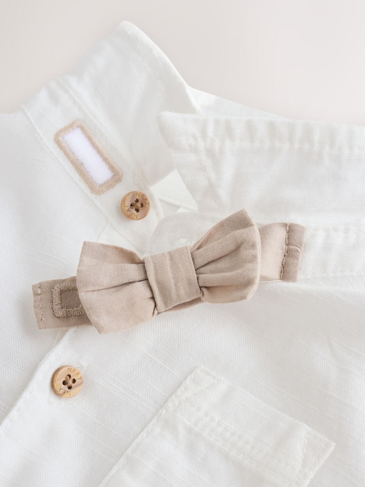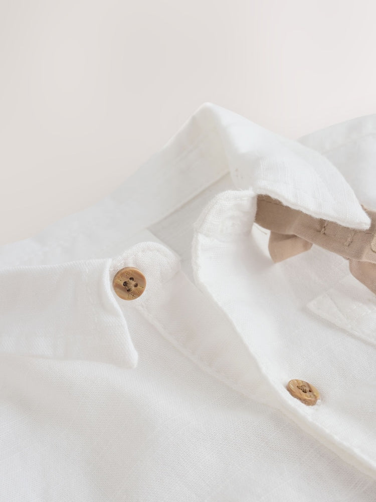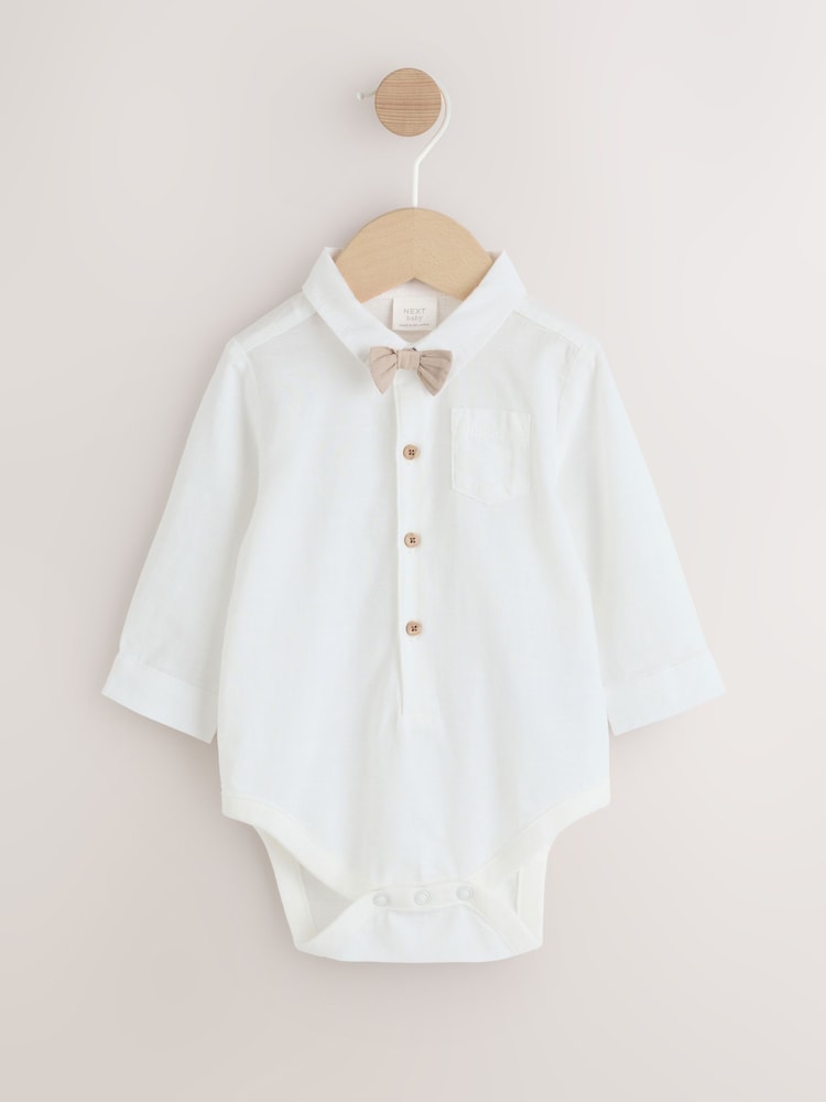 Introduce your little one to timeless elegance with this sage green three-piece set, expertly designed for formal occasions. Featuring a long-sleeved cotton shirt with an attached mock bow tie and coordinating trousers complete with integrated braces, this ensemble delivers sophisticated style with practical comfort. The soft, breathable fabric and convenient popper fastening on the shirt bodysuit make dressing effortless, while machine washability ensures easy care. Crafted from premium cotton with elastane-reinforced braces for durability, this set combines refined tailoring with the flexibility growing babies need.