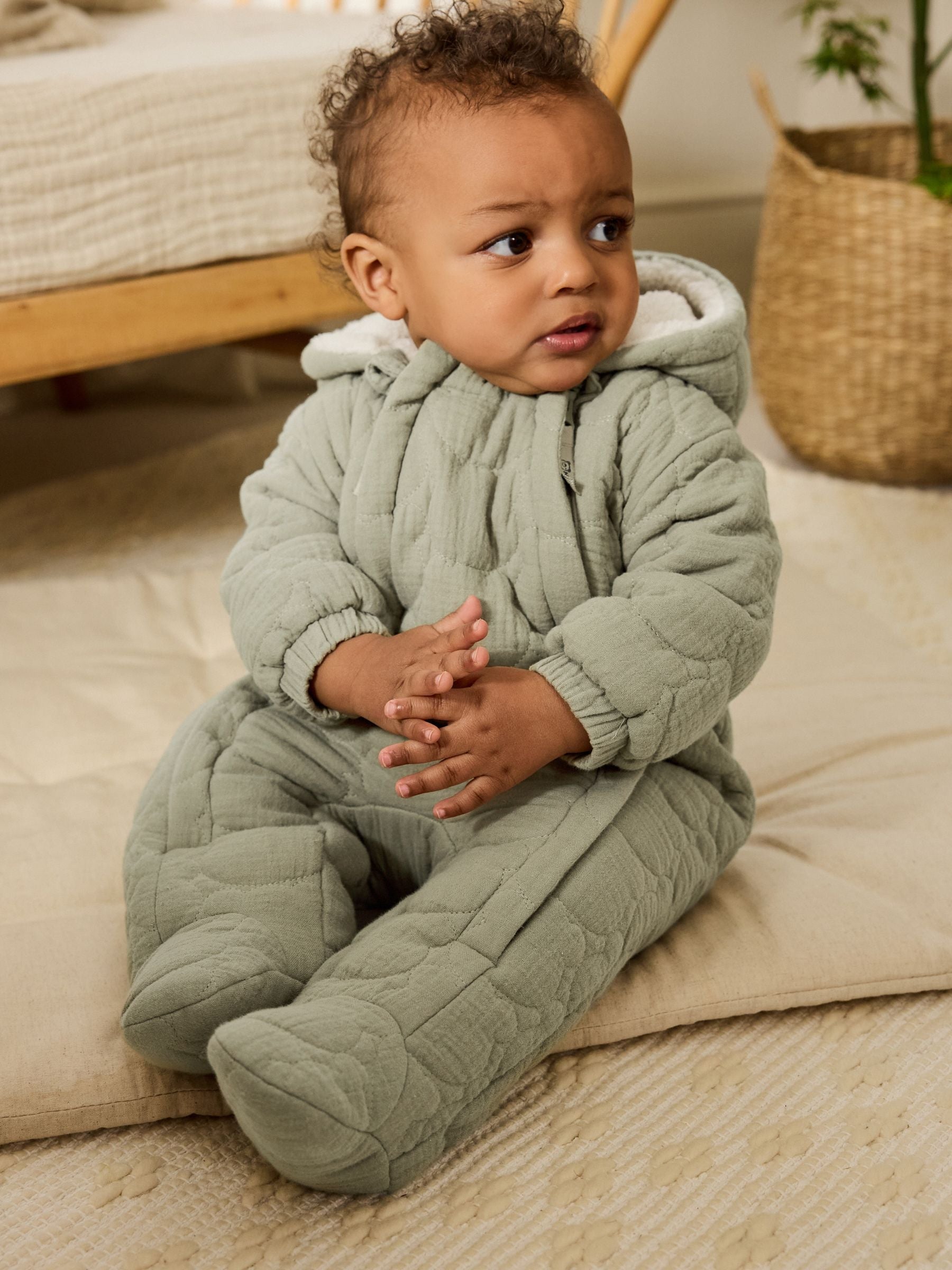 This cosy and stylish pramsuit is made from a soft crinkle-effect cotton fabric with stitched all-over quilting and a double zip fastening for easy wear. A borg fleece lining keeps them warm, with a set-in hood and elasticated sleeve cuffs. Double zip fastening Borg fleece lining Quilted Crinkle cotton outer Hooded Main 100% Cotton. Lining 100% Recycled polyester. Wadding 100% Recycled polyester. Country of Origin: China Warning: Keep away from fire and flames.