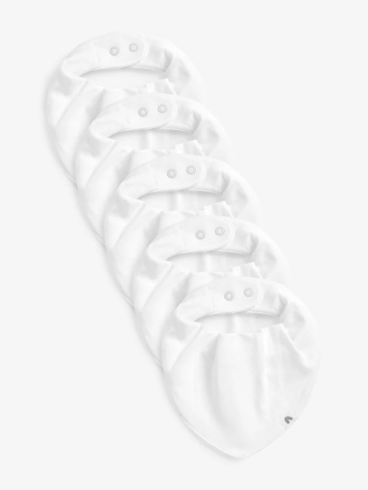 Protect your little one's clothes with this essential five-pack of white baby bibs. Crafted from soft, absorbent cotton with a plush terry towelling backing, these bibs effectively contain spills and dribbles while keeping baby comfortable and dry. The elasticated strap and secure snap closure make dressing effortless, while the chemical-free construction ensures safety for delicate skin. Machine washable for convenient care, these versatile bibs are a nursery staple that grows with your baby through feeding and playtime.