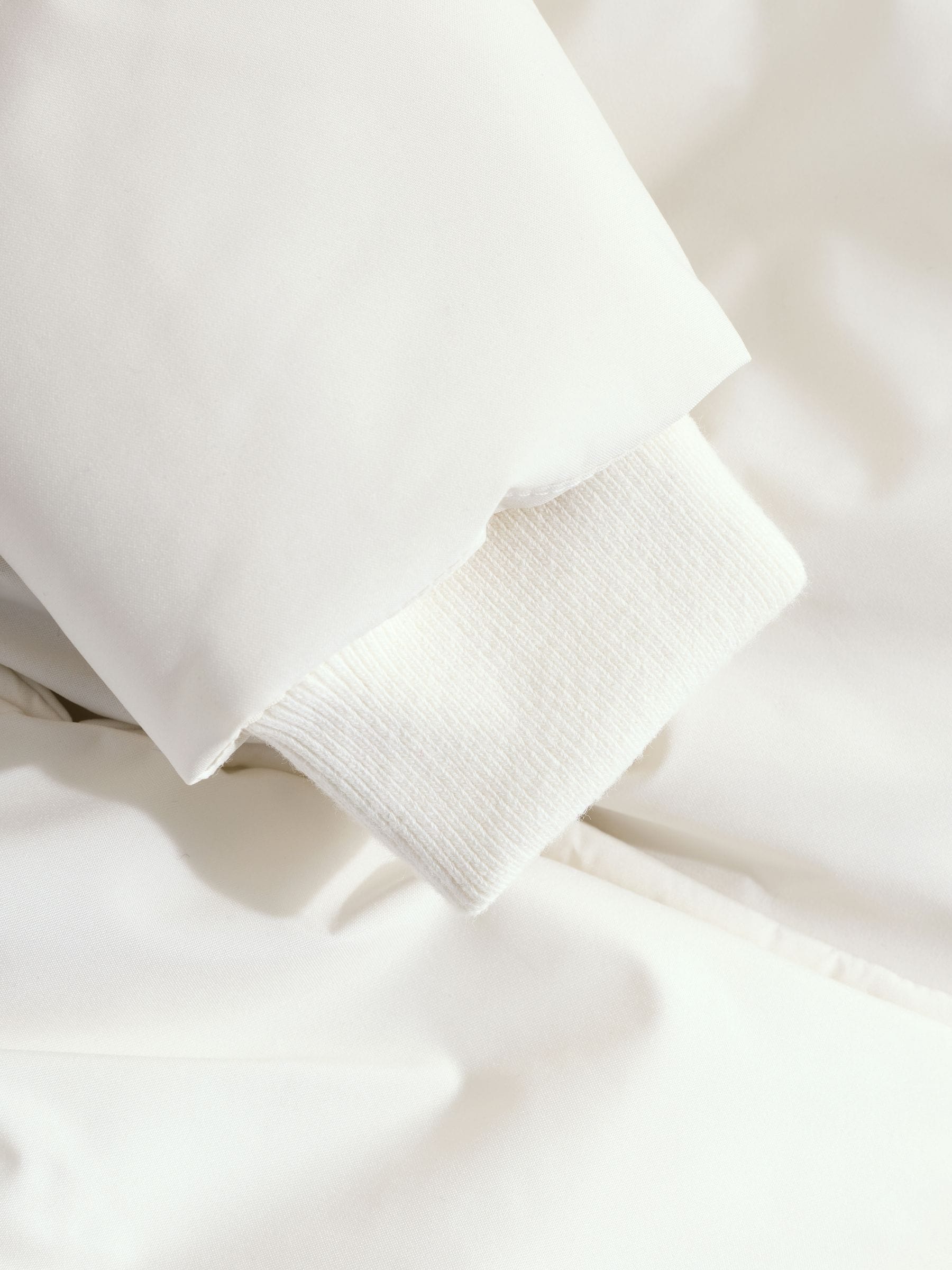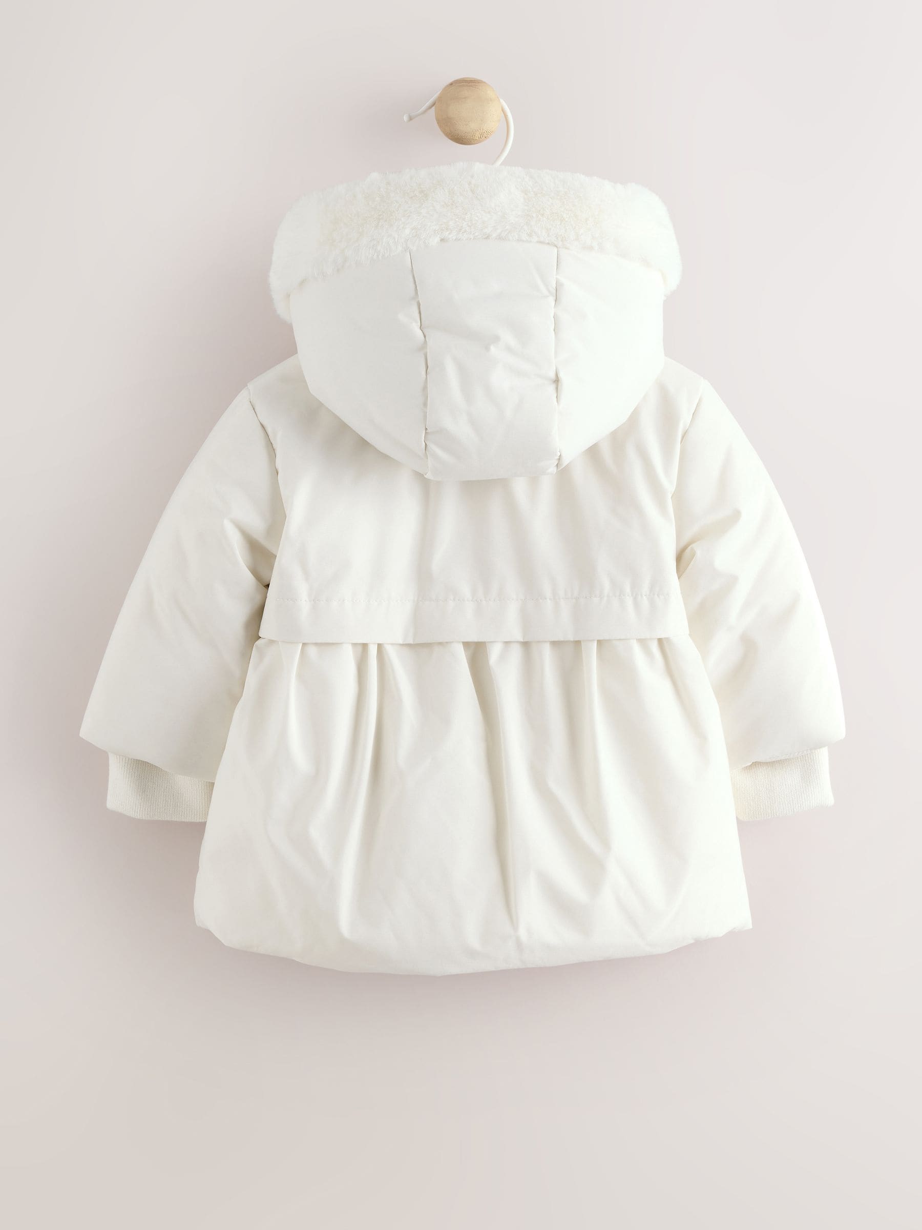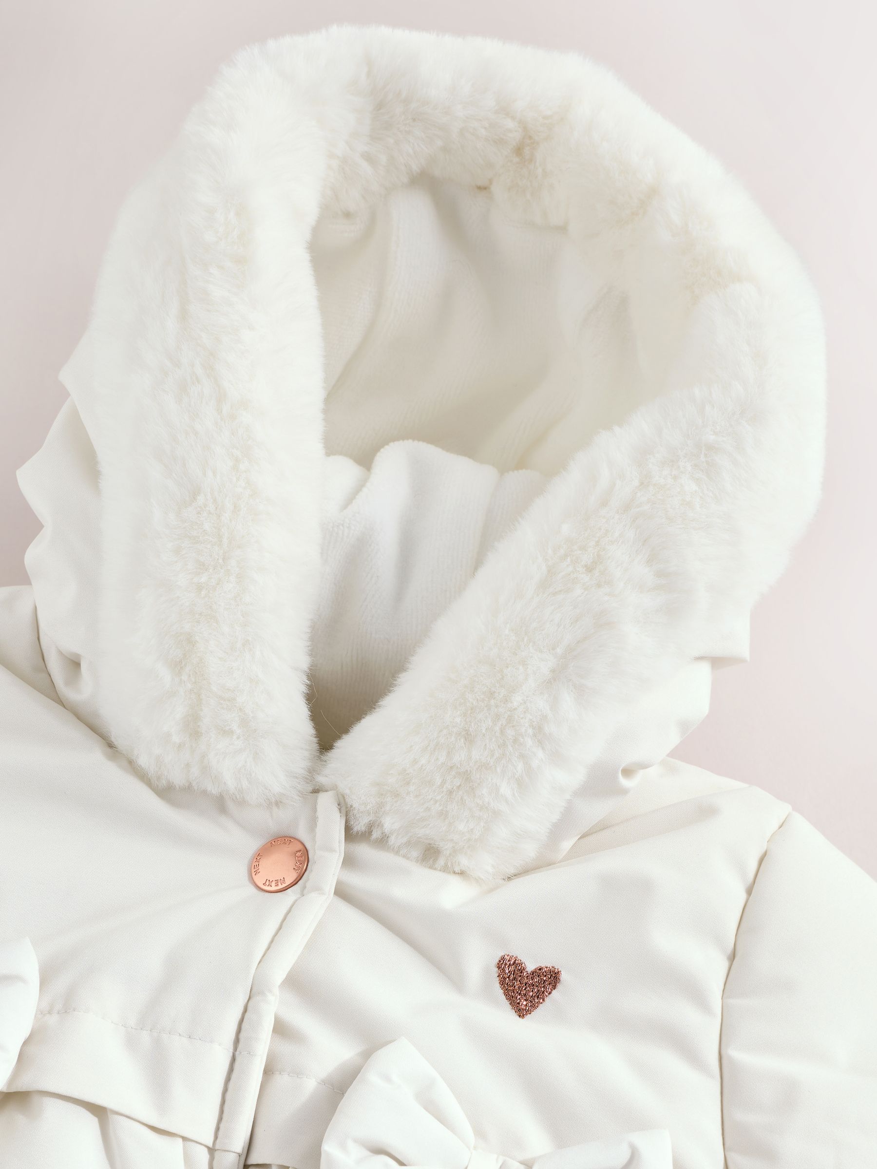 Keep your little one cosy in this charming white puffer jacket. The soft fleece lining, fur-trimmed hood and bow attachment provide a comfortable feel for cooler days. With a zip-front placket and front embroidery, it's a perfect blend of style and warmth. Puffer jacket Bow attachment Fur hood trim Fleece-lined Zip-front placket Front embroidery Machine washable. Main 100% Recycled polyester. Body Lining 80% Cotton, 20% Polyester. Sleeve Lining 100% Recycled polyester. Hood 100% Recycled polyester. Wadding 100% Recycled polyester. Country of Origin: China Warning: Keep away from fire and flames.
