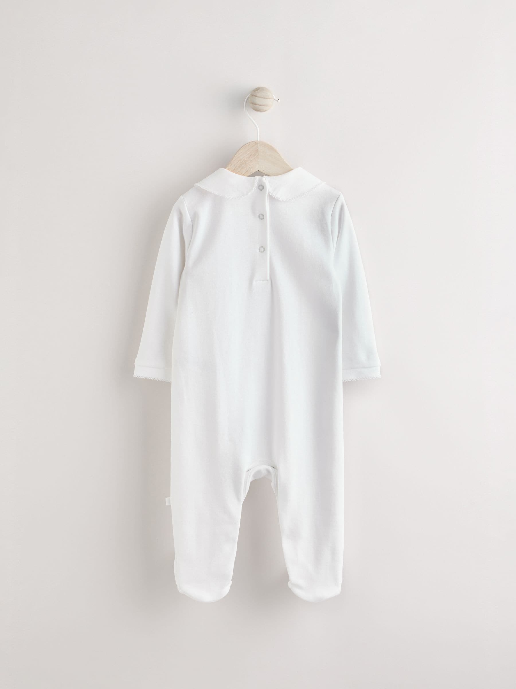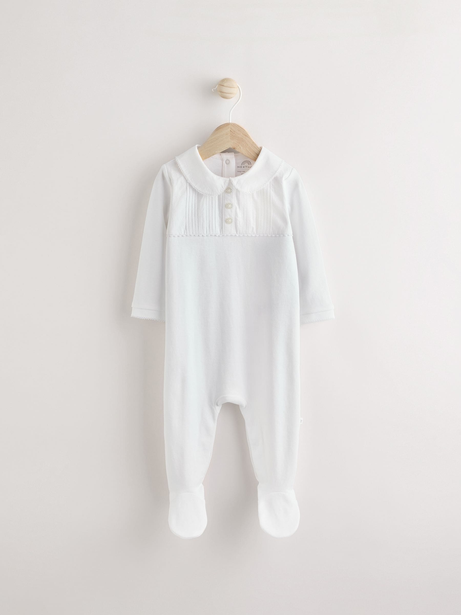 Made from pure cotton, this adorable white sleepsuit is super soft with collar detailing and pleated design, featuring a popper fastening for easy dressing, long sleeves and inner lined feet. Anti slip soles have been added to sizes 9-12 months and up. 100% cotton Popper fastening Collar detail Long sleeves Inner lined feet Machine washable. 100% Cotton. Country of Origin: India Warning: Keep away from fire and flames.