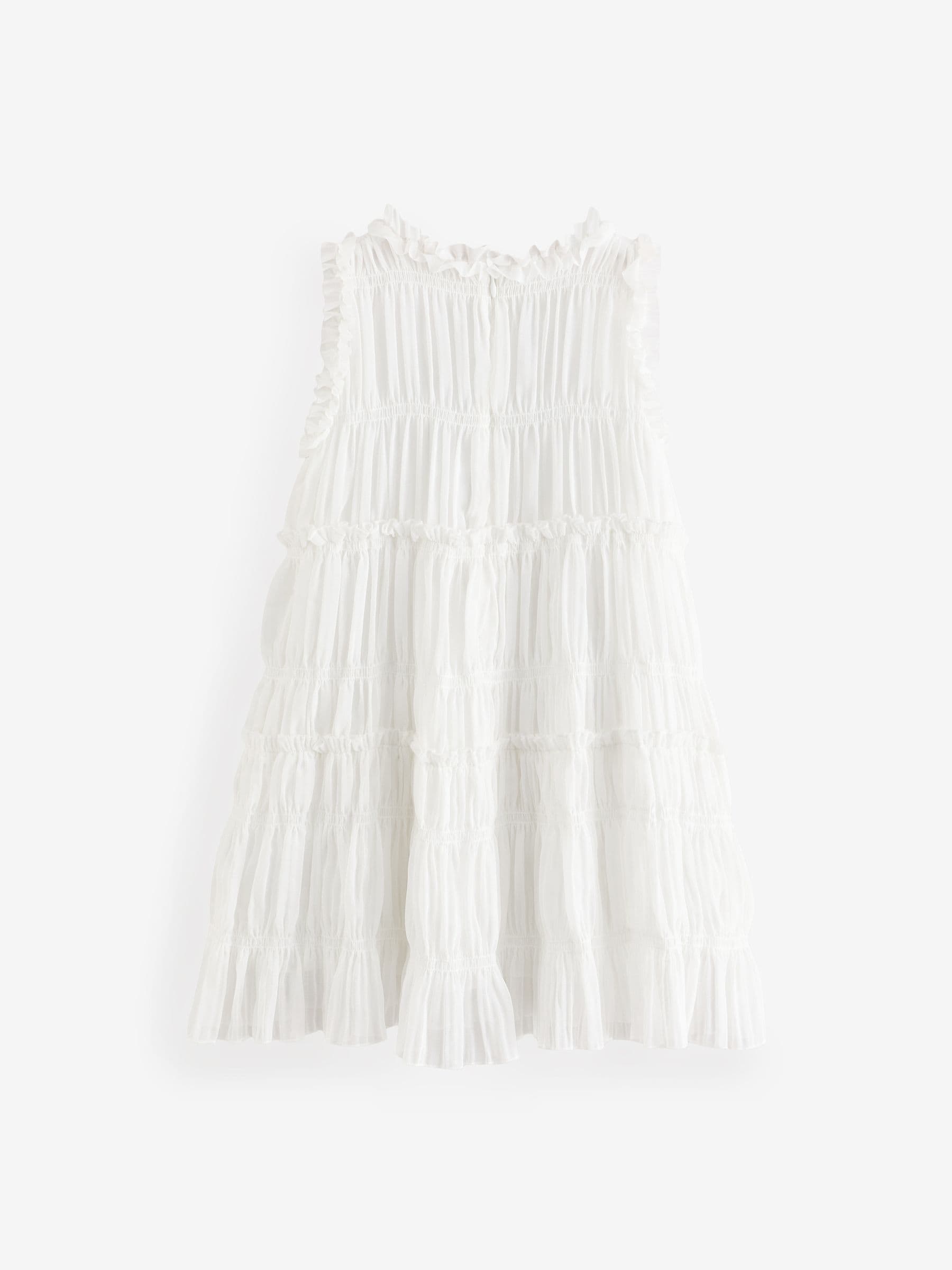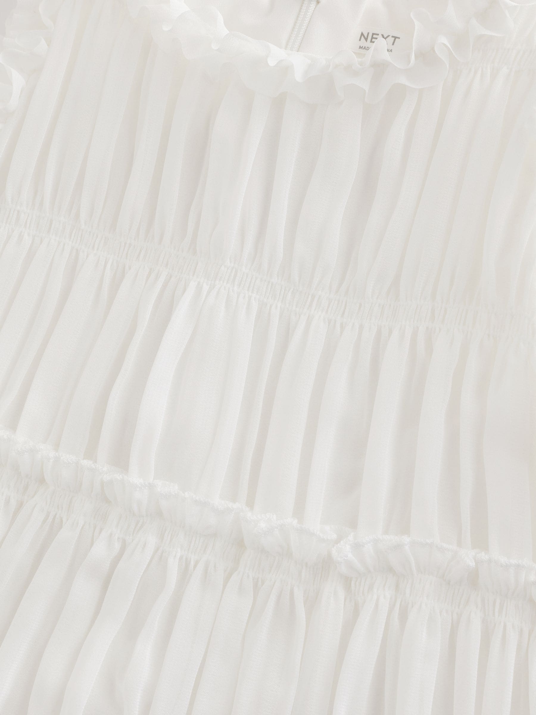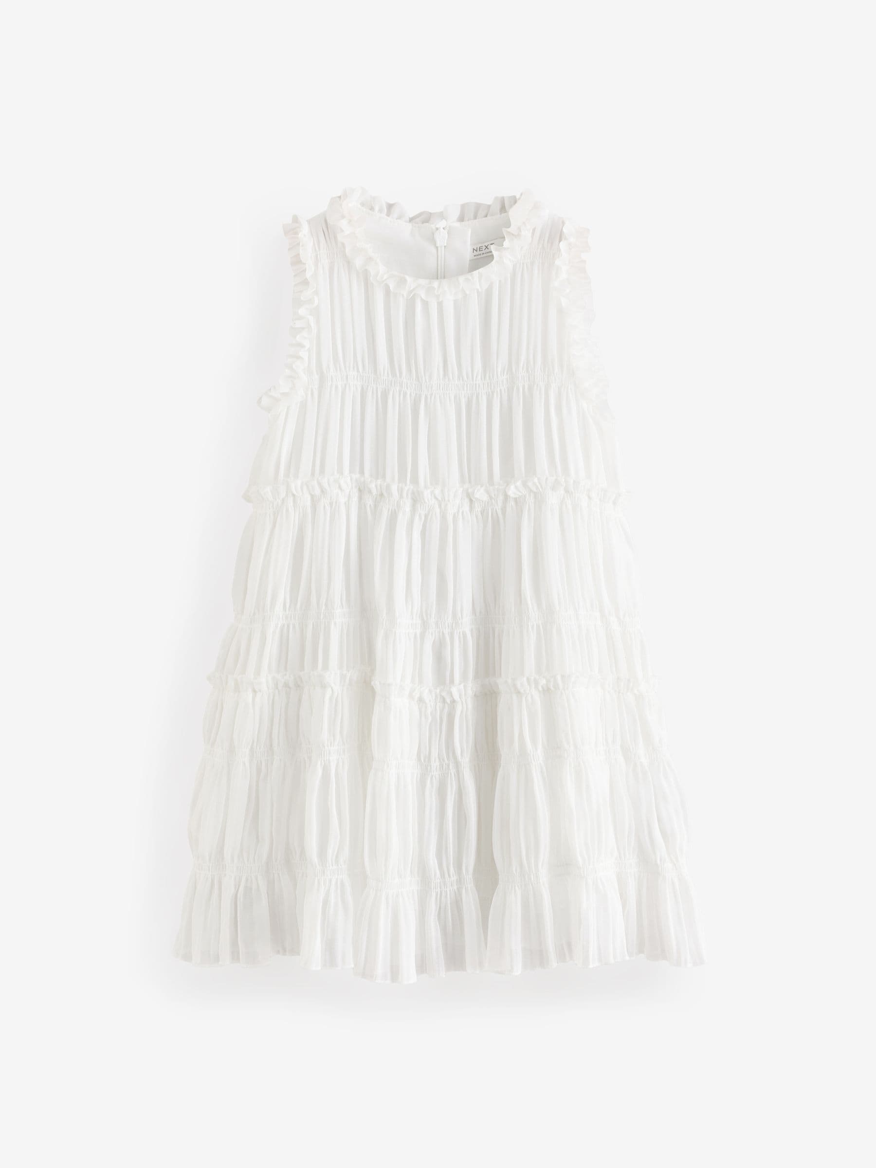 Perfect for birthday parties, weddings and more, this pretty white dress has a soft chiffon fabric in a tiered design with pretty ruffle detailing, finished with a zip fastening to the back. Soft chiffon fabric Tiered design Ruffle detailing Zip fastening Main 99% Recycled polyester, 1% Elastane. Lining 100% Recycled polyester. Country of Origin: China